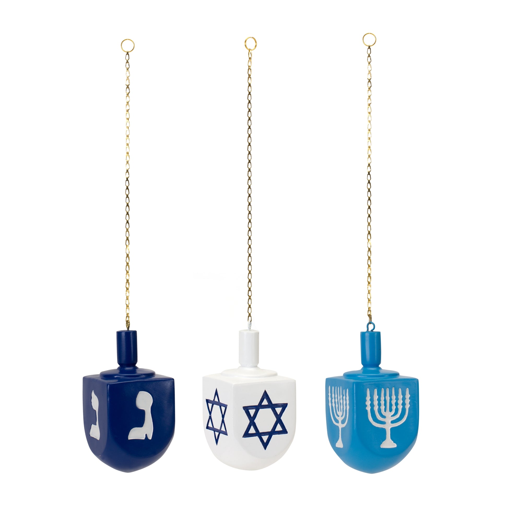 Celebrate Hanukkah in style this year with a stunning set of Dreidel Ornaments. Featuring three assorted designs, the traditional dreidel design paired with the cool blue and white tones makes this set a great addition to your Hanukkah home decor. The quality polyresin and metal composition is sure to last for seasons to come.