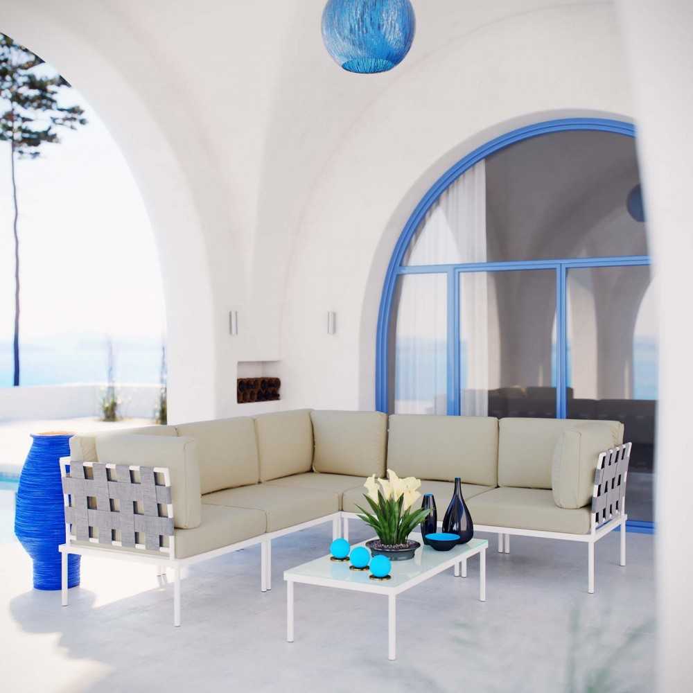 Harmony 6 Piece Outdoor Patio Aluminum Sectional Sofa Set, White Beige, EEI-2627-WHI-BEI-SET