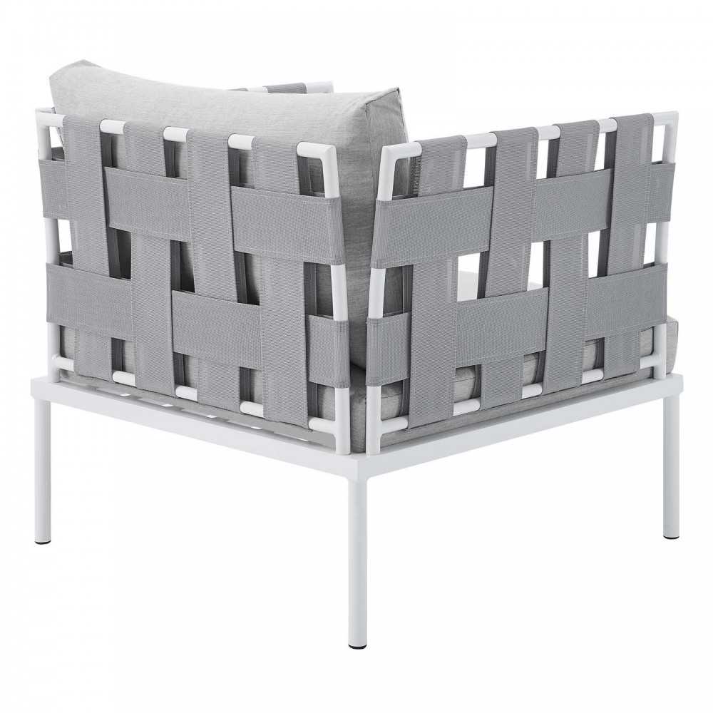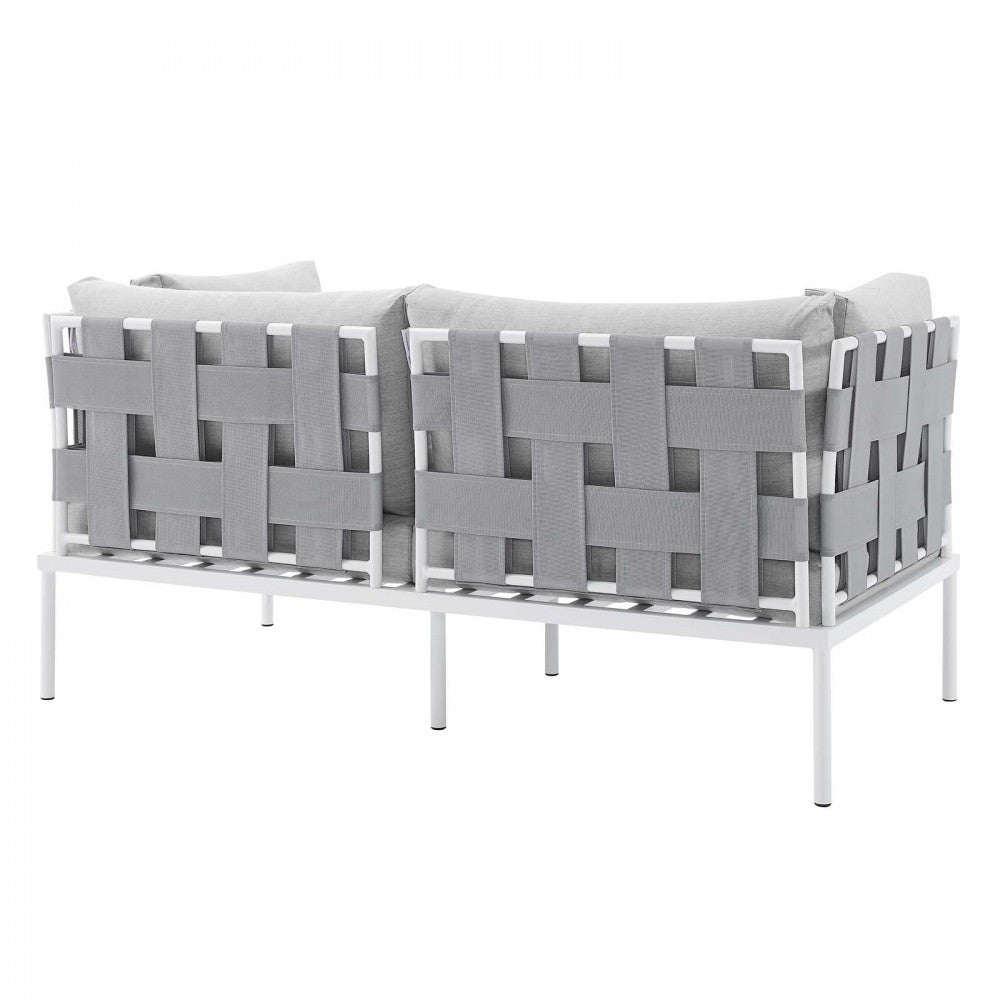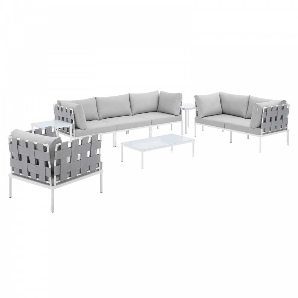 Engage life with Harmony. Enjoy casual conversation under the open sky with an all-weather waterproof furniture set that delivers an exceptional outdoor porch, patio, balcony or garden experience. An exceptional modern furniture set that exceeds expectations, Harmony comes with long-lasting machine washable Sunbrella fabric cushions, silk polyester seat back weave, square powder coated aluminum bases, tempered glass top tables, and non-marking foot caps. A sectional that arranges according to the spontaneous needs of your guests, set your sights on open and inspired moments with the Harmony Outdoor Patio Collection. Set Includes: 1 Loveseat, 1 Armchair, 2 Corner Chairs, 1 Armless Chair, 2 Side Tables, 1 Coffee Table