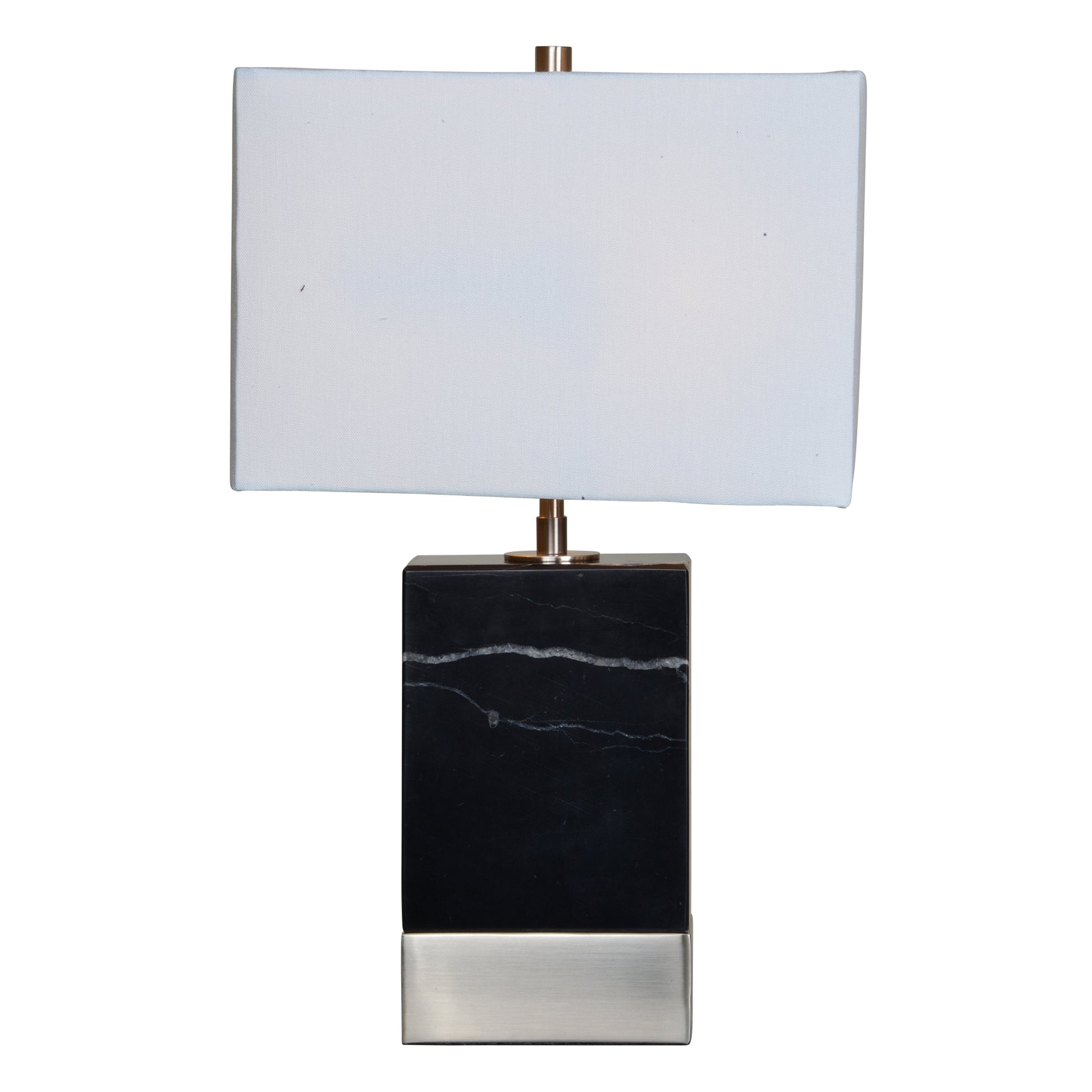 The satin nickel finish and solid stone design of this decorative table lamp brings metropolitan glamour to modern interiors. Delicate white veins throughout the black marble lamp base will vary from piece to piece, making each lamp one of a kind. With a rectangular shape that mimics the strong angles of the lamp base, the coordinating off-white fabric lampshade prevents ornate from being over the top.