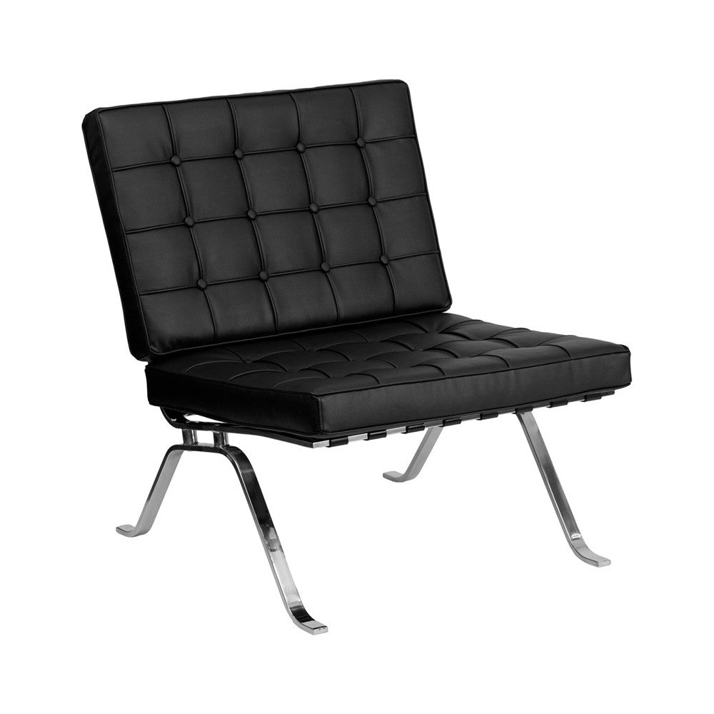 Blaze a new trail and take your decorating aesthetic to the next level. Style and function blend seamlessly in this LeatherSoft lounge chair with its vintage, contemporary design that lends a sleek upscale look to any space. This armless guest chair features an exposed polished stainless steel frame, button tufted cushions and curved designer legs. The posh look of this piece makes it an excellent choice for your reception, hospitality or waiting areas as well as your living room or bedroom. [ZB-FLASH-801-CHAIR-BK-GG]
