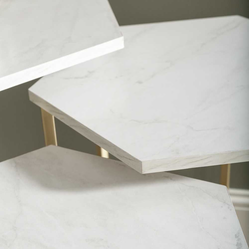 Hexagon Modern Wood Nesting Tables, Set of 3 - Faux White Marble/Gold