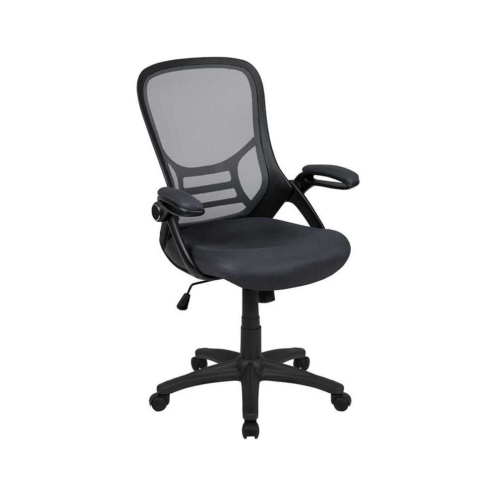 Fall into comfort on this ultra-padded swivel office chair that'll add personality to your home office or professional office space. Put that old chair to rest, having the support of an ergonomic office chair will help improve your attitude when you no longer must sit in discomfort. This modern office chair is equipped with a lever to control the seat height and activates the seat recline. Mesh office chairs are popular due to their ventilated mesh material that allow air to circulate to your back, keeping you cool and calm. Paired with a contoured padded seat with pressure relieving waterfall edge and a high back this executive office chair will integrate into any space. If you like working with your chair raised high a flip-up arm chair is perfect allowing you to flip the arms upward like an armless chair while pulling yourself close to your desk. You'll have no problem taking charge of your workday perched on this high back ergonomic office chair with flip-up arms. You'll wish you had purchased this chair sooner, whether as a personal purchase or to accommodate your entire staff. [HL-0016-1-BK-DKGY-GG]