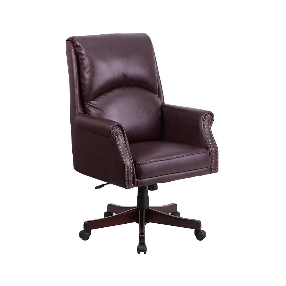 This luxurious traditional chair features soft Burgundy LeatherSoft upholstery and brass nail accents that trim the rolled arms. Having the support of an ergonomic office chair may help promote good posture and reduce future back problems or pain. High back office chairs have backs extending to the upper back for greater support. The high back design relieves tension in the lower back, preventing long term strain. The plush pillow back cushion provides excellent support, allowing your back to rest comfortably. Chair easily swivels 360 degrees to get the maximum use of your workspace without strain. The pneumatic adjustment lever will allow you to easily adjust the seat to your desired height. The mahogany wood base adds to the charm of a traditional appearance. [BT-9025H-2-BY-GG]