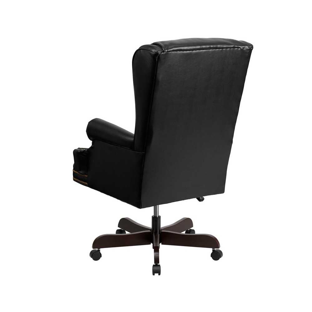 This button tufted black executive office chair combines old world craftsmanship with 21st century ergonomic seating principles, giving you a chair that feels as good as it looks. It redefines traditional elegance with its softer edges, subtle styling, and amazing comfort. The generously padded headrest will take the pressure off of your neck while leaning back. High back office chairs extend to the upper back for greater support and relieve tension in the lower back, preventing long term strain. Chair easily swivels 360 degrees to get the maximum use of your workspace without strain. The pneumatic adjustment lever will allow you to easily adjust the seat to your desired height. The rolled arms are adorned with individual brass nail trim. The heavy duty mahogany wood capped base adds to the traditional, elegant styling of this chair. [CI-J600-BK-GG]