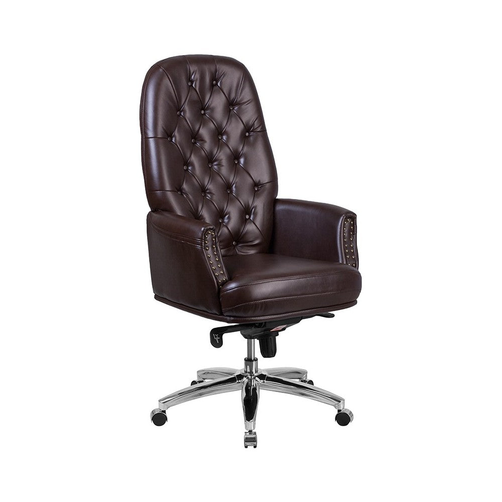 This brown, button tufted, LeatherSoft upholstered executive office chair combines old world craftsmanship with modern seating principles, giving you a chair that feels as good as it looks. Fully upholstered, padded arms with brass nail accents add a touch of sophisticated class. LeatherSoft is leather and polyurethane for added softness and durability. High back office chairs extend to the upper back for greater support. The high back design relieves tension in the lower back, preventing long term strain. The multi-tilt lock mechanism rocks/tilts and locks the chair in infinite positions while the tilt tension adjustment knob adjusts the chair's backward tilt resistance. The free rein motion is great for taking a quick break from typing to answer phone calls and relax. Chair easily swivels 360 degrees to get the maximum use of your workspace without strain. The pneumatic adjustment lever will allow you to easily adjust the seat to your desired height. The heavy duty chrome base and dual wheel casters add modern flair while giving you almost effortless movement. [BT-90269H-BN-GG]