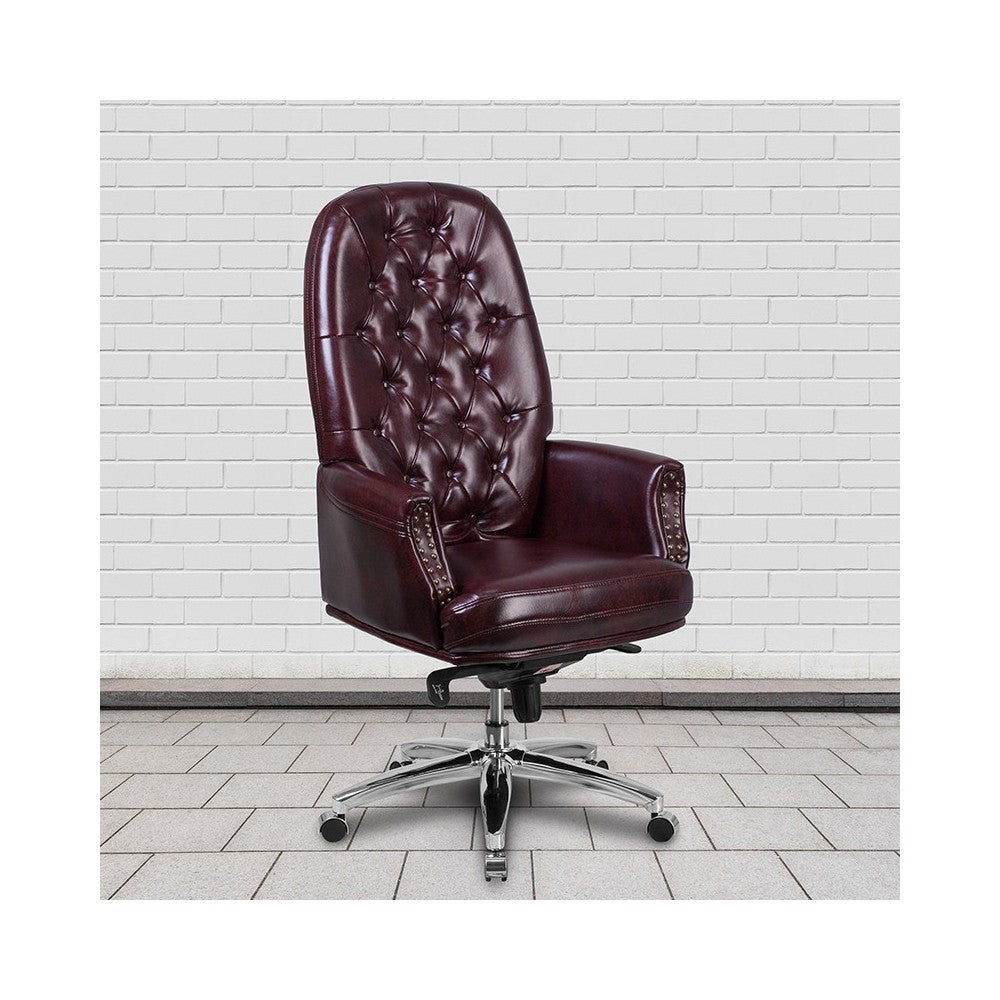 This burgundy, button tufted, LeatherSoft upholstered executive office chair combines old world craftsmanship with modern seating principles, giving you a chair that feels as good as it looks. Fully upholstered, padded arms with brass nail accents add a touch of sophisticated class. LeatherSoft is leather and polyurethane for added softness and durability. High back office chairs extend to the upper back for greater support. The high back design relieves tension in the lower back, preventing long term strain. The multi-tilt lock mechanism rocks/tilts and locks the chair in infinite positions while the tilt tension adjustment knob adjusts the chair's backward tilt resistance. The free rein motion is great for taking a quick break from typing to answer phone calls and relax. Chair easily swivels 360 degrees to get the maximum use of your workspace without strain. The pneumatic adjustment lever will allow you to easily adjust the seat to your desired height. The heavy duty chrome base and dual wheel casters add modern flair while giving you almost effortless movement. [BT-90269H-BY-GG]