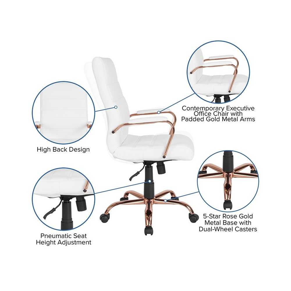 An elegant blend of comfort and style, this high-back LeatherSoft office chair is the perfect seating solution for your workspace. Crafted from white LeatherSoft material with rose gold arms and base, the ergonomic design brings a sleek look with ample durability and support for long-term use. Designed for exceptional comfort, this LeatherSoft office chair features a cushioned seat and back upholstered in white LeatherSoft for softness and durability. Padding on the arms lends additional comfort, while horizontal stitching along the seat and back adds a touch of refinement. The high-back office chair features extended height to support your upper back and help relieve back tension. A waterfall front seat edge removes pressure on your lower legs, to help improve circulation during long hours at your desk. Complete your custom fit with the pneumatic seat height adjustment lever and a tilt-lock mechanism for a rocking and reclining motion. Easily maneuver through a variety of tasks with the full 360-degree swivel chair motion that is ideal for shifting between your computer, phone, and more. When you need to reach things a little further away, simply roll your chair with the smooth movement of the wheeled base. A bright rose gold finish adorns the frame and arms of this office desk chair, creating a sleek and timeless look. The classic white LeatherSoft pairs effortlessly with any office decor style, creating a comfortable and elegant impression that's perfect for residential or corporate workspaces. [GO-2286H-WH-RSGLD-GG]