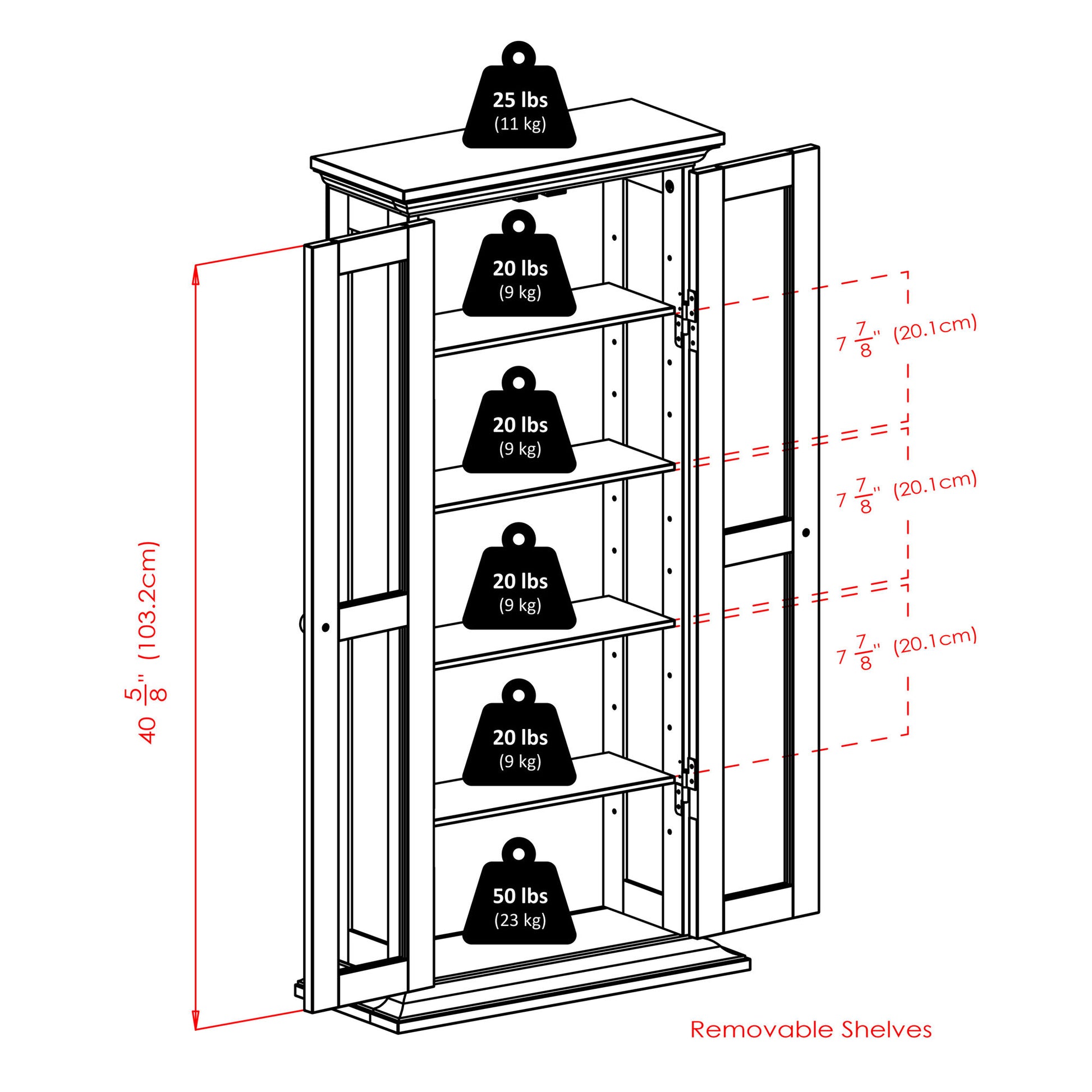 Elegantly styled with traditional profiled trim and deep stain. 5 adjustable shelves offer storage for up to 135 DVDs, 205 CDs or 75 videocassettes. With glass door inserts and satin nickel-finish metal hardware. Warm walnut finish.