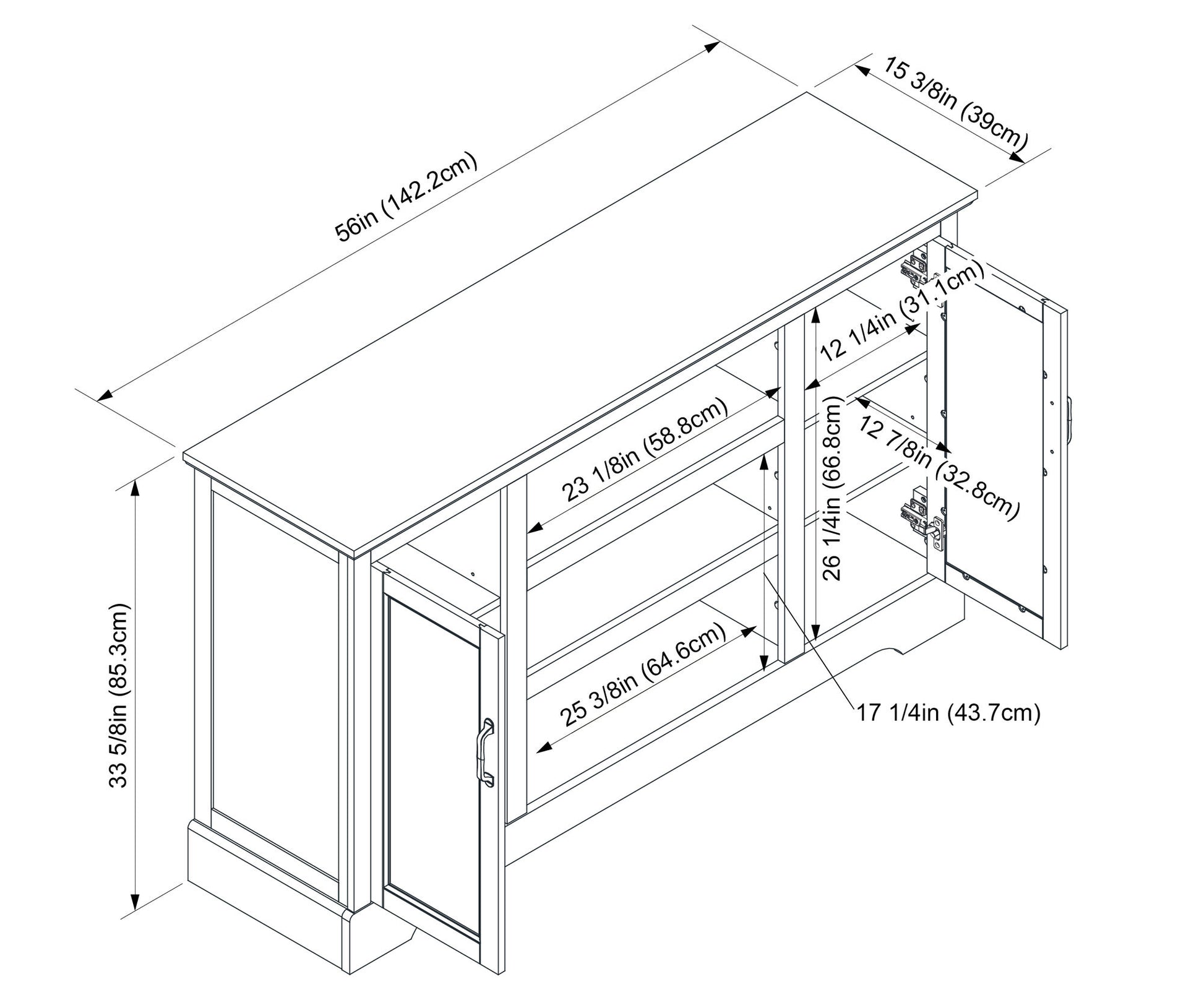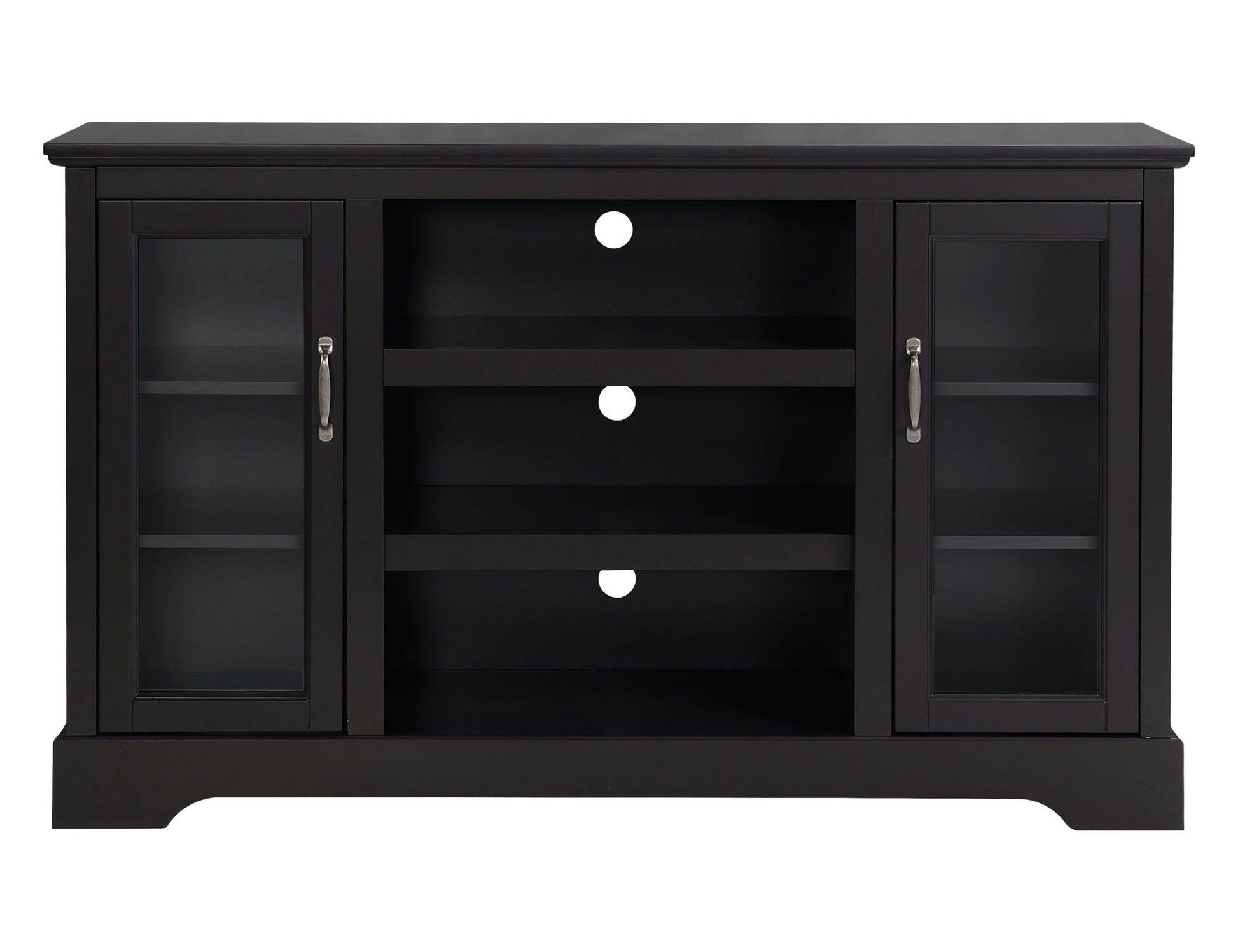 This beautiful espresso finish TV stand is sure to make a statement in any room. Three shelves with cable management provide storage for video games an blue ray systems while two side cabinets with two shelves give ample storage for movies and accessories. Tempered framed glass doors finish off the look.