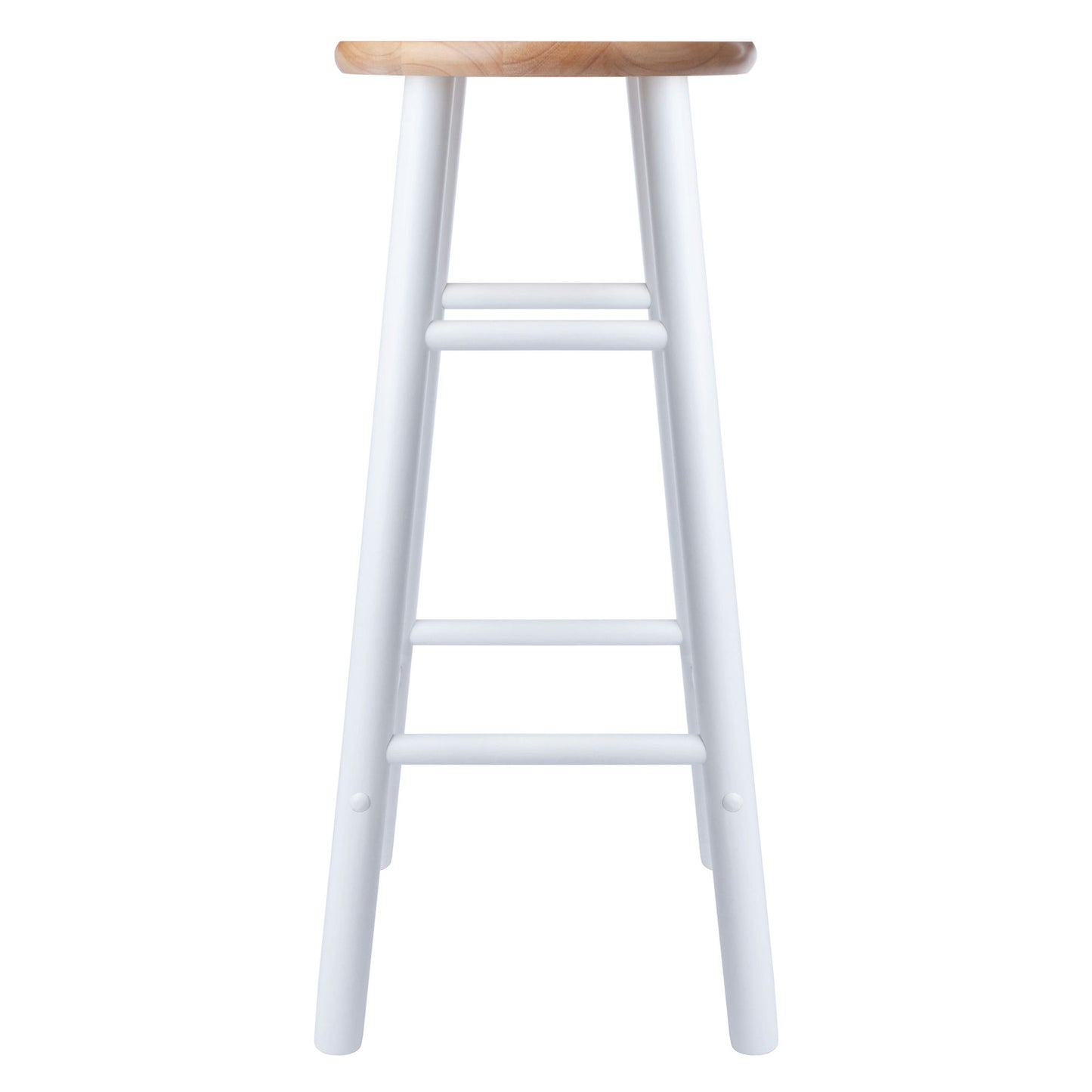 With a more conservative foot print than many other flared-leg stools, the Winsome 2-piece Huxton 29"H Bar Stools have a streamlined, contemporary look and tuck neatly underneath a counter or high table. Made of Solid Wood, the crisp, clean combination of a Teak-finished seat and White base will fit with any decor from farmhouse to transitional to modern. Both high and low crossbars on all sides provide stability while also serving as convenient footrests.