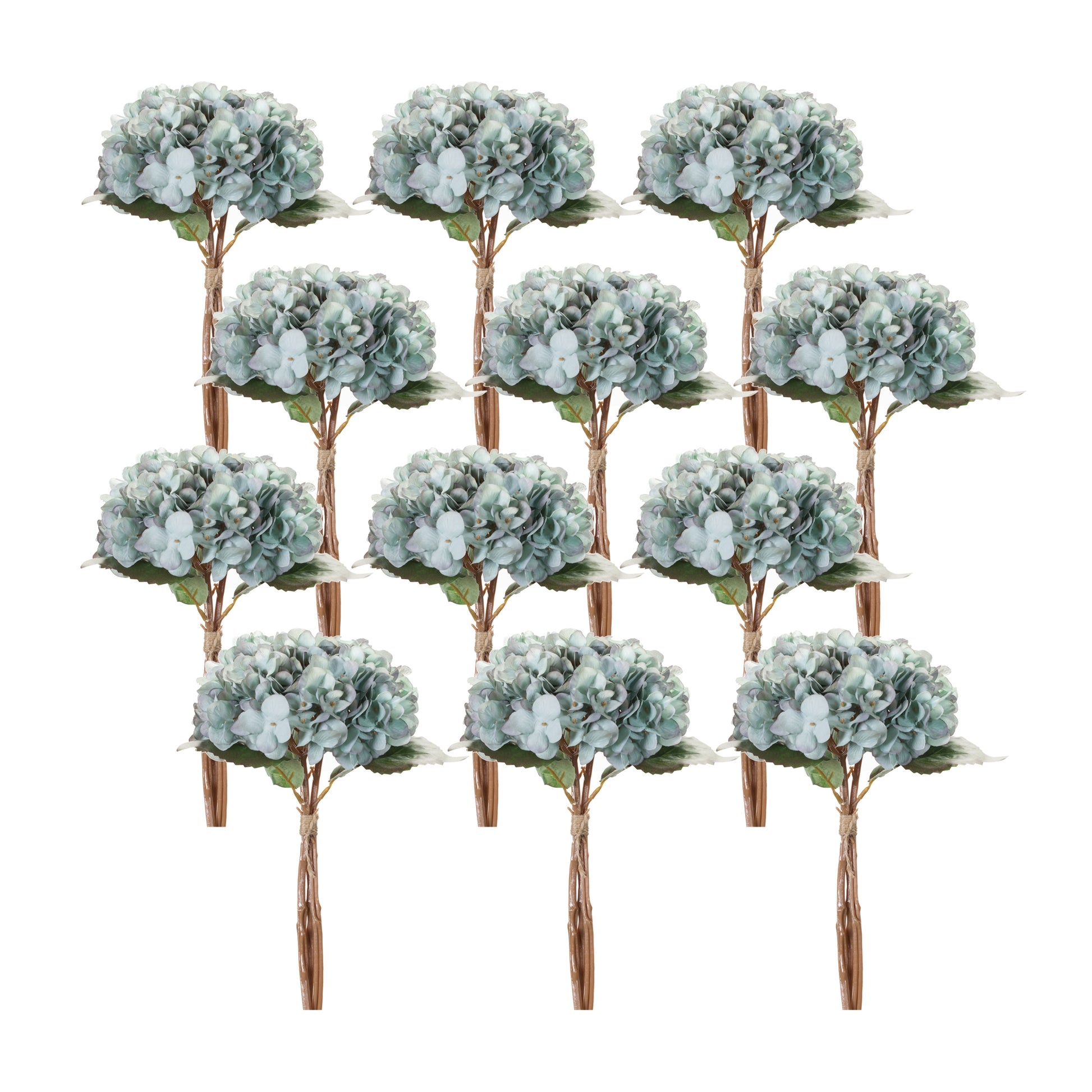 Welcome the spring season with this beautiful set of Hydrangea Bundles. Featuring twelve pieces, this set would be a great addition to your spring floral vases or arrangements. The cool blue flowers paired with the warm green foliage and twine tie is the perfect combination to create a stunning spring display. The quality polyester flowers are sure to last for seasons to come.