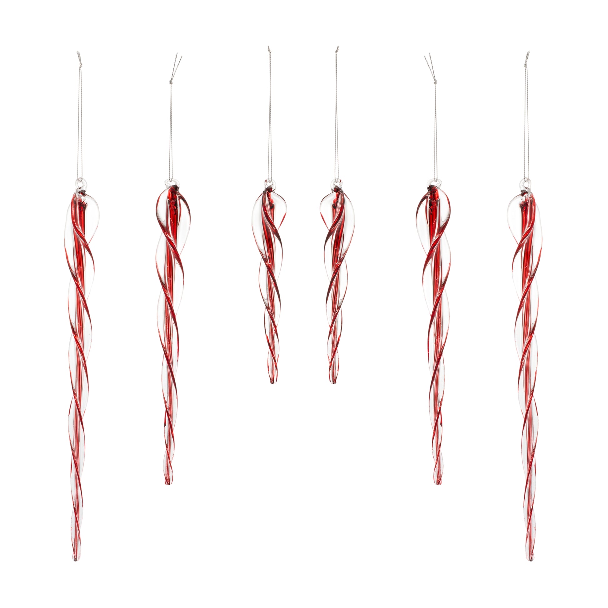 Adorn your Christmas Tree with this beautiful set of Icicle Ornaments. Featuring three assorted sizes, the intricate swirled glass design paired with the bright red accent makes this set the perfect additiont to your holiday tree decor. The pieces can be used as gifts for friends to cherish, or you can display the set on your own Christmas tree and enjoy them for years to come.