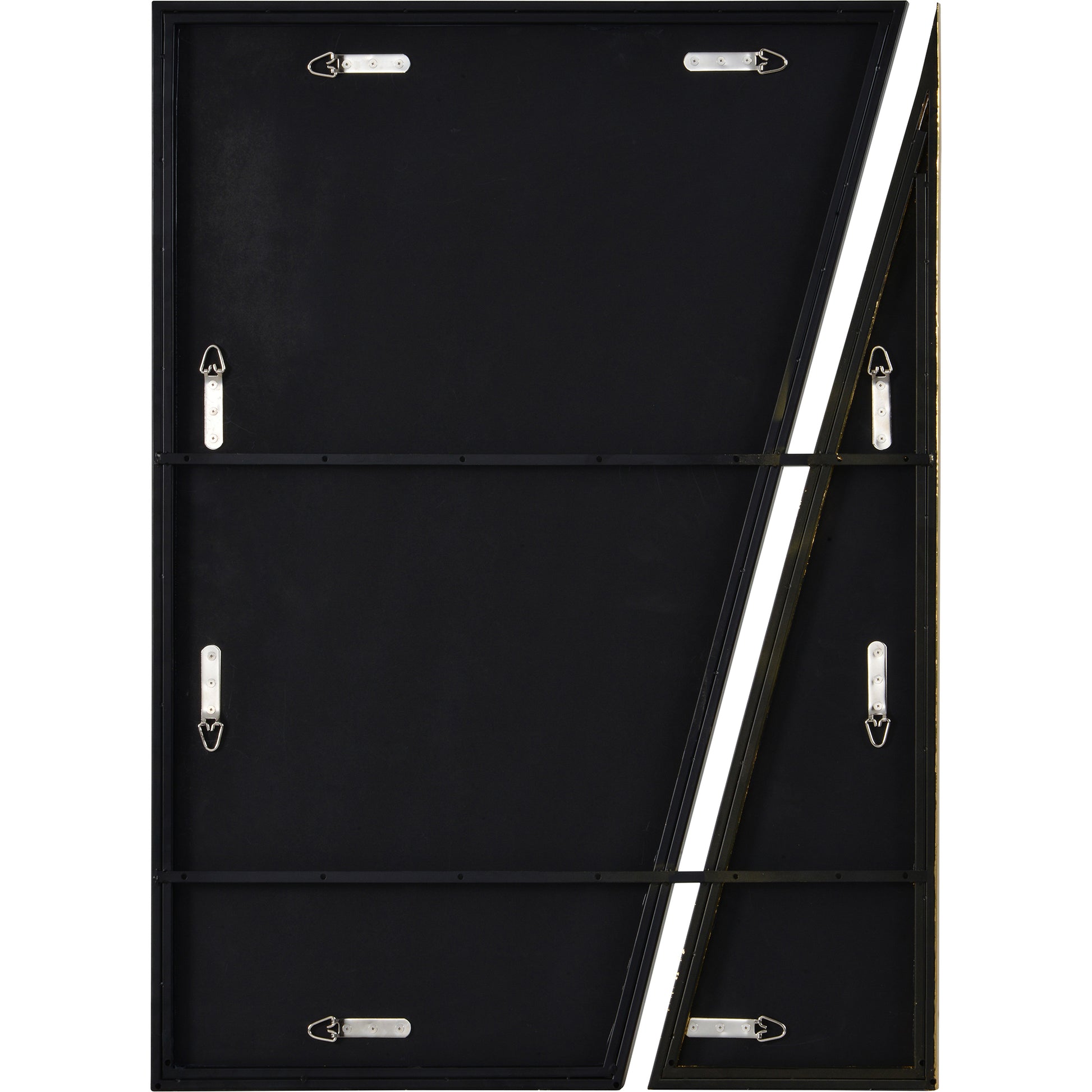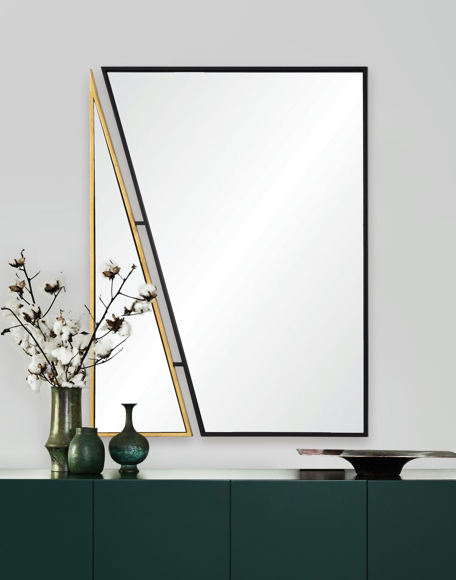 Artistic design at its finest. This geometrically designed mirror shines with a minimalist palette and cutting-edge design. Black powdered metal and gold leaf finished wood take shape within the angular structure, appearing at once bold and simplistic. Hang within an industrial style home to allow the distinct lines to make a powerful statement.