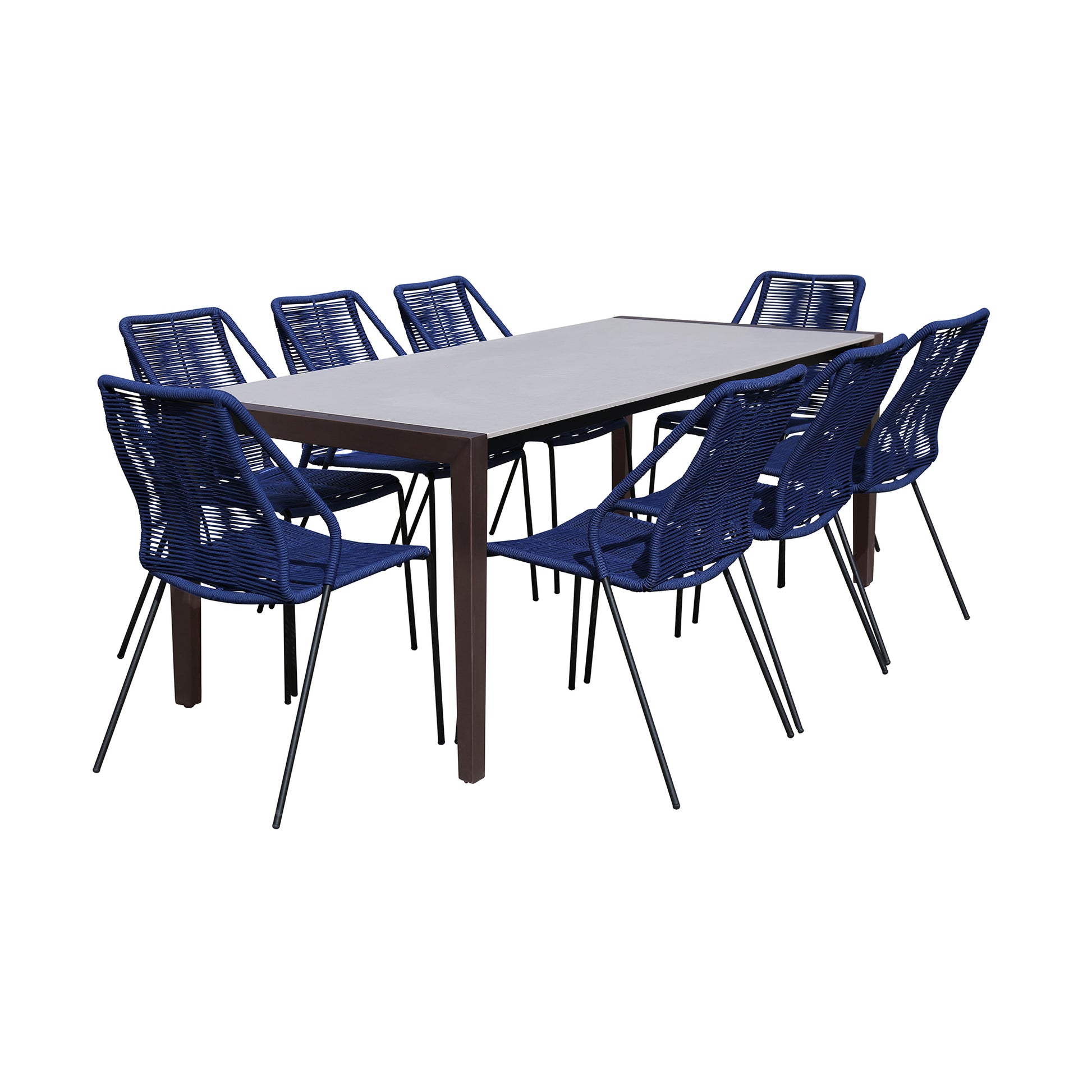 The Fineline and Clip Indoor Outdoor 9 Piece Dining Set in Dark Eucalyptus Wood with Super Stone and Blue Rope is a durable and fashionable addition to any indoor or outdoor space. Just the piece for festive alfresco feasts and summertime soirees, this table features a unique tabletop made of a 5-layer composite with 2 layers of cement fiberboard surrounding the aluminum honeycomb core. This beautiful tabletop is durable and robust - capable of withstanding inclement weather and everyday wear and tear. The 80” width of the Fineline dining table is perfect for entertaining a large group of family and friends - making your outdoor area the place to be. Eucalyptus is a good choice for garden furniture as it has antifungal and antimicrobial properties. This means it has an inherent property to resist decay, rot and garden pests and can face the harshest of adverse climate-whether harsh sun, icy cold winds, cruel snow, or torrential rain. It is also rich in oil that naturally repels moisture and water. Each of the clip chairs are made with the best craftsmanship, with these chairs standing on top of durable metal legs in a Blue finish for a modern look. For use indoors and out, the soft UV coated nylon cords are hand dyed resulting in subtle tonal variations. This Fineline and Clip Indoor Outdoor 9 Piece Dining Set in Dark Eucalyptus Wood with Super Stone and Blue Rope comes complete with one Fineline Indoor Outdoor 80" Rectangle Dining Table in Dark Eucalyptus Wood and Super Stone and 8 Clip Indoor Outdoor Stackable Steel Dining Chairs with Blue Rope. Table Dimensions: 81"W x 35"D x 30"H. Chair Dimensions: 22"W x 25"D x 35"H SH: 18.6".