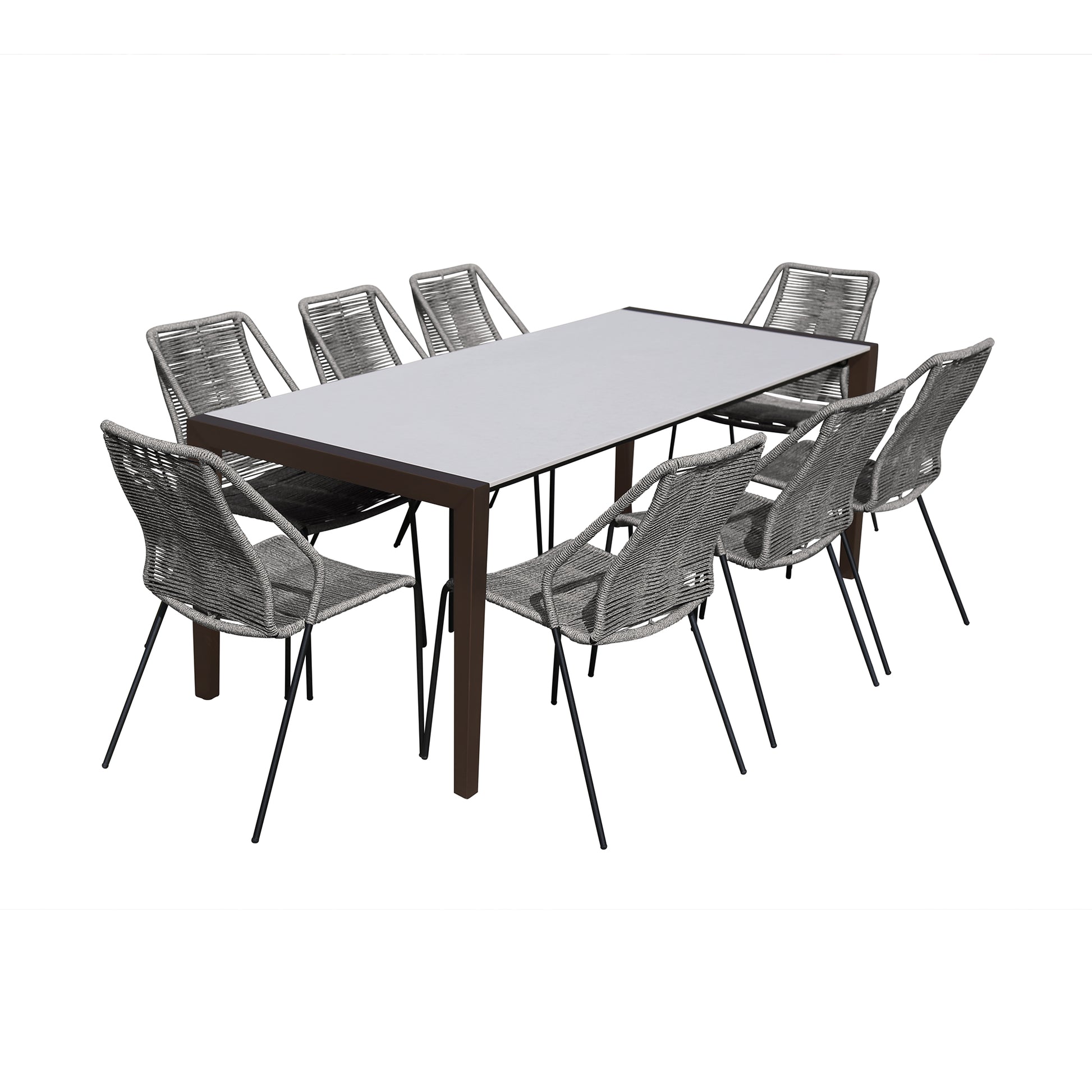 Indoor 9 Piece Dining Set in Dark Wood with Superstone and Grey Rope