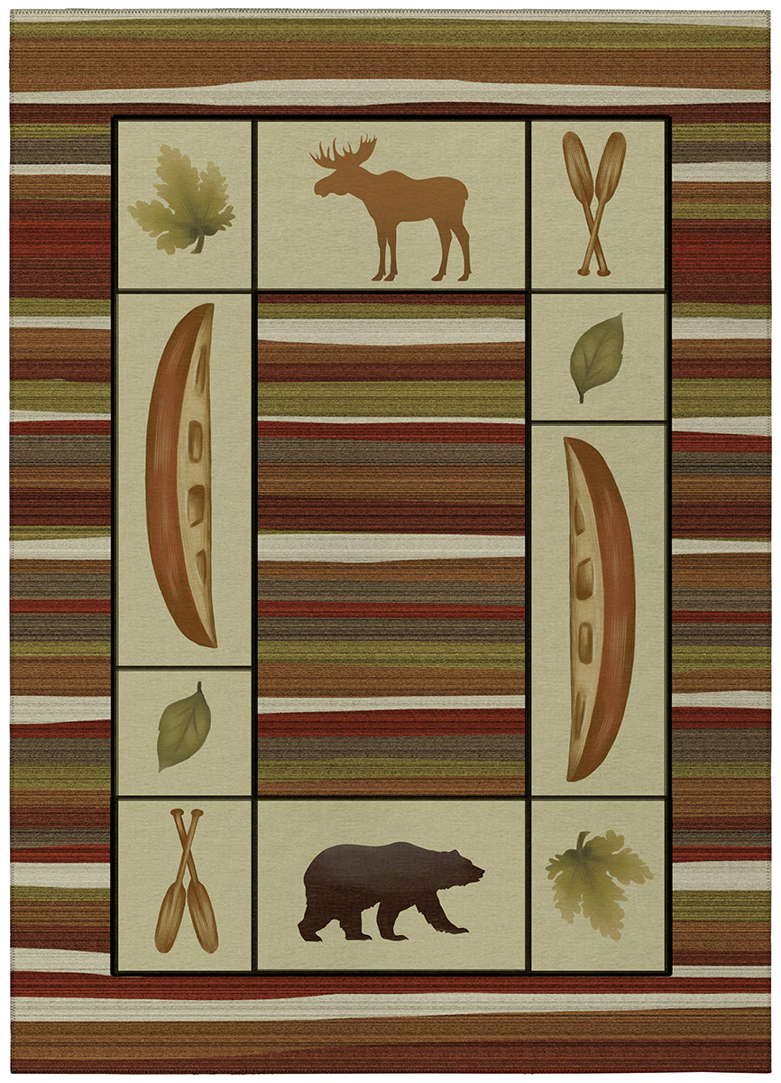 Excursion collection has great casual lodge designs, rustic motifs perfect for lake house, cabin, or man cave. Featuring an ultra-soft and ultra thin pile, each rug is made with 100% polyester pile complete with a non-skid backing. Crafted in the USA using Foreign & Domestic materials and US labor. They are UV Stabilized for indoor and cover outdoor spaces. Shake out or use straight suction with vacuum, do not use a beater bar. Machine washable in cold water and air dry, some sizes may be too large for a residential washing machine and is family and pet friendly.