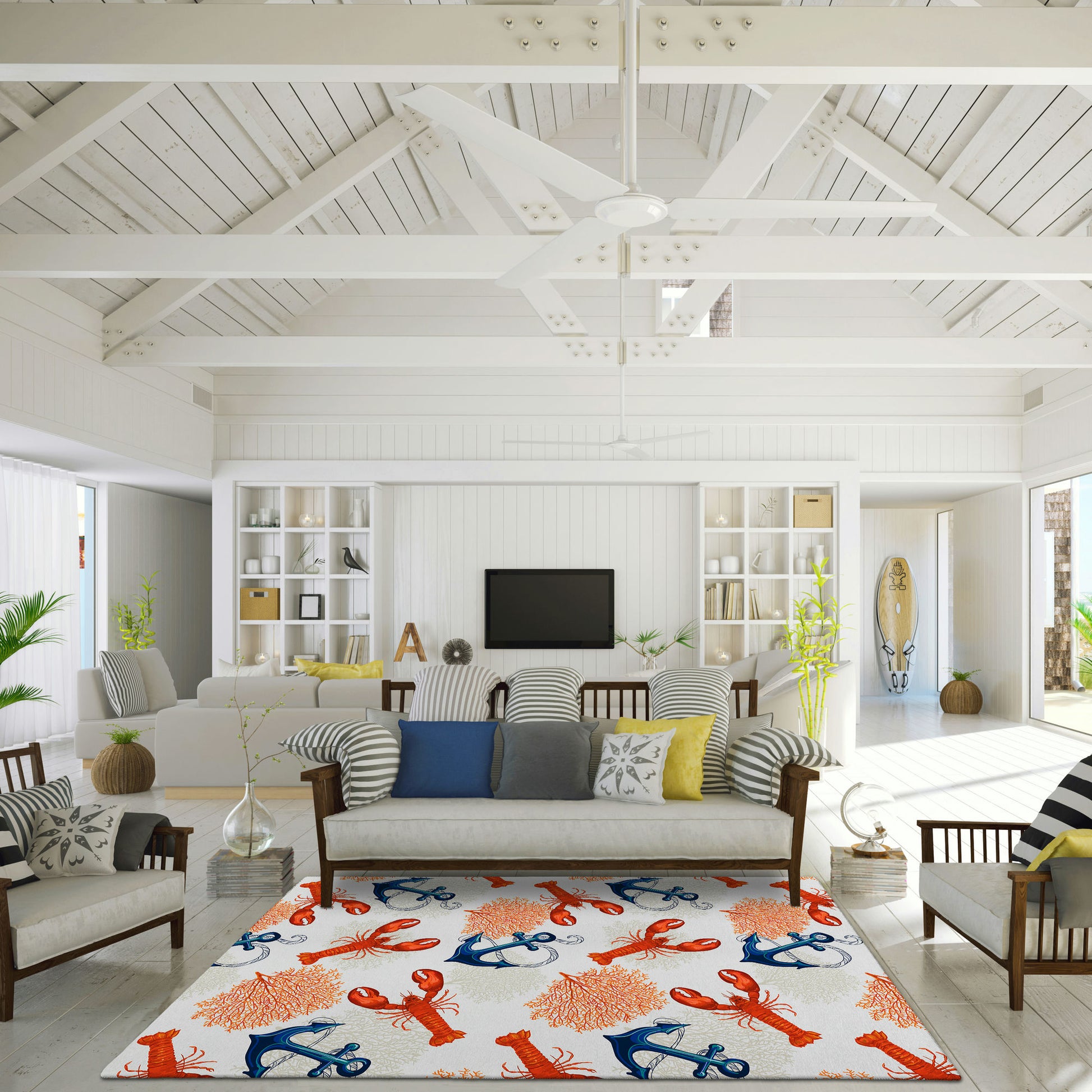 Habor is a fun, beach and coastal themed inspired collection that gives you all the vibes of summer sunshine. Featuring an ultra-soft and ultra thin pile, each rug is made with 100% polyester pile complete with a non-skid backing. Crafted in the USA using Foreign & Domestic materials and US labor. They are UV Stabilized for indoor and cover outdoor spaces. Shake out or use straight suction with vacuum, do not use a beater bar. Machine washable in cold water and air dry, some sizes may be too large for a residential washing machine and is family and pet friendly.