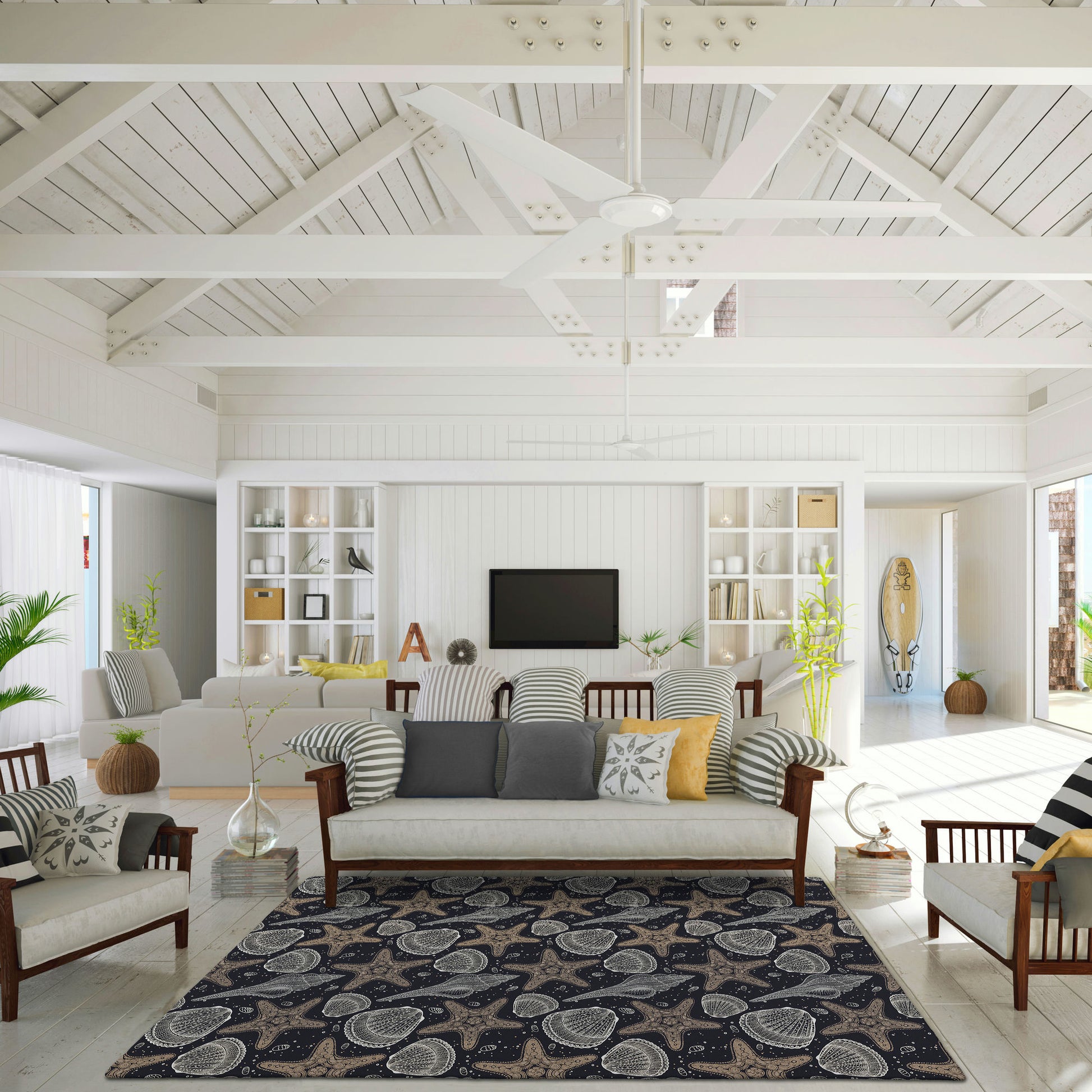 Remarkable Seabreeze collection has been created to inspire tranquility. Wow your guests with these versatile casual coastal rugs, stylish flat weave rug features vibrant colors with gradient movement in a variety of natural beach mosaic shapes and patterns. Featuring an ultra-soft and ultra thin pile, each rug is made with 100% polyester pile complete with a non-skid backing. Crafted in the USA using Foreign & Domestic materials and US labor. They are UV Stabilized for indoor and cover outdoor spaces. Shake out or use straight suction with vacuum, do not use a beater bar. Machine washable in cold water and air dry, some sizes may be too large for a residential washing machine and is family and pet friendly.