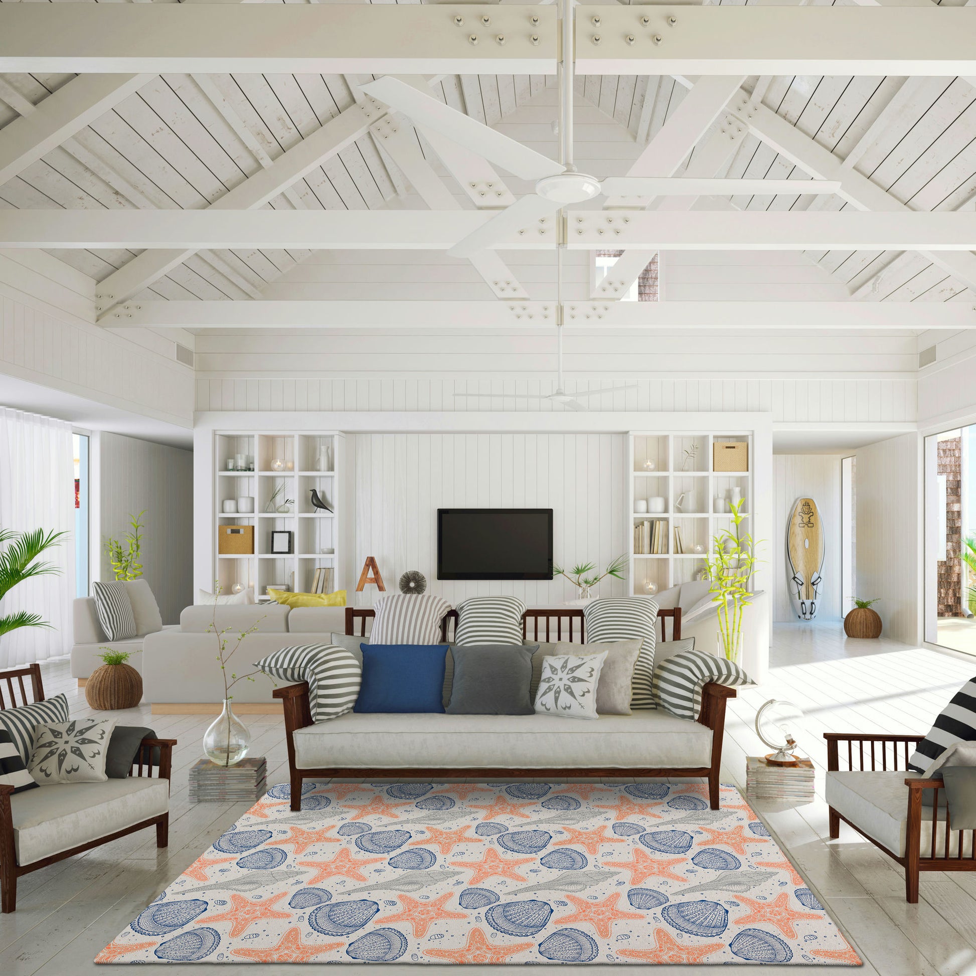 Remarkable Seabreeze collection has been created to inspire tranquility. Wow your guests with these versatile casual coastal rugs, stylish flat weave rug features vibrant colors with gradient movement in a variety of natural beach mosaic shapes and patterns. Featuring an ultra-soft and ultra thin pile, each rug is made with 100% polyester pile complete with a non-skid backing. Crafted in the USA using Foreign & Domestic materials and US labor. They are UV Stabilized for indoor and cover outdoor spaces. Shake out or use straight suction with vacuum, do not use a beater bar. Machine washable in cold water and air dry, some sizes may be too large for a residential washing machine and is family and pet friendly.