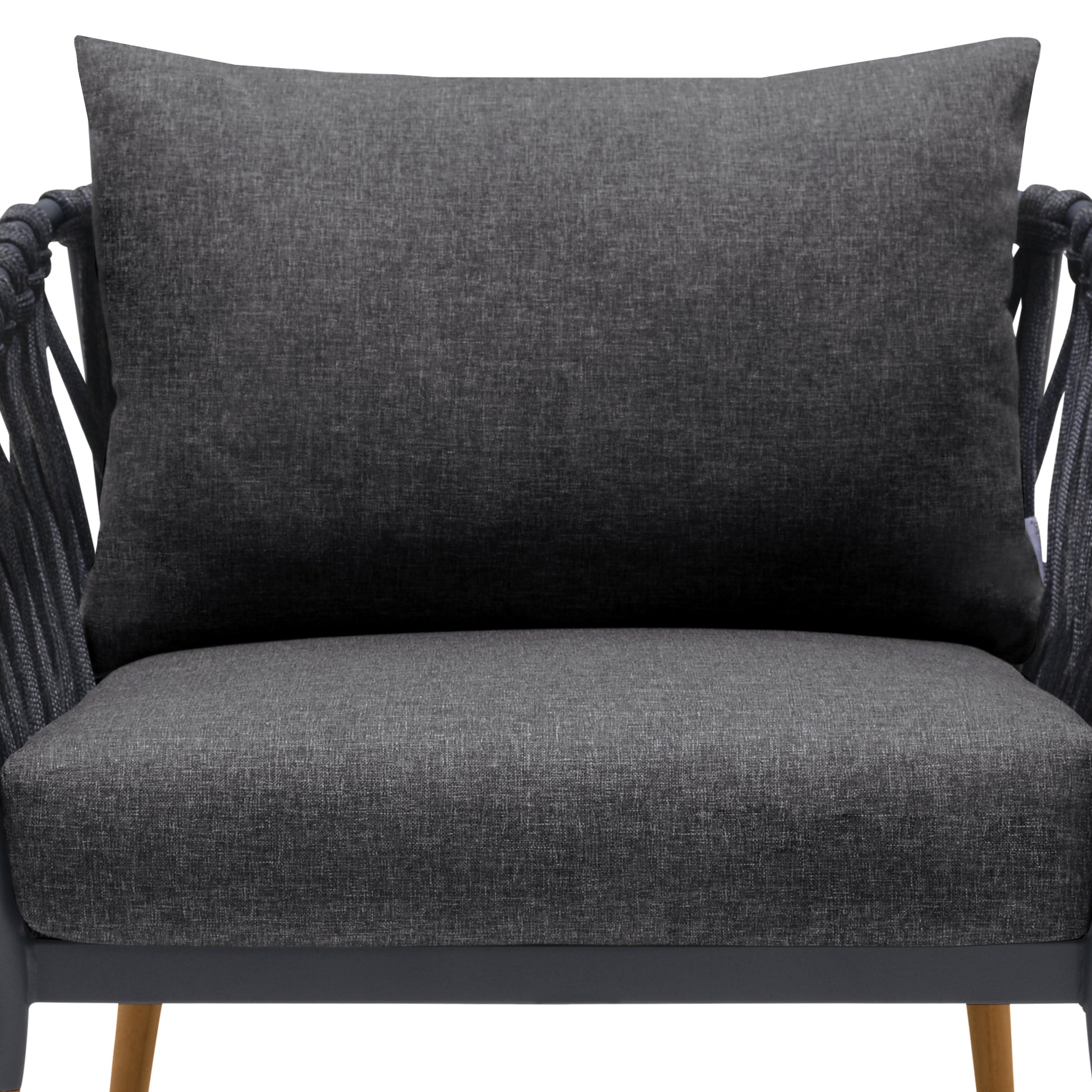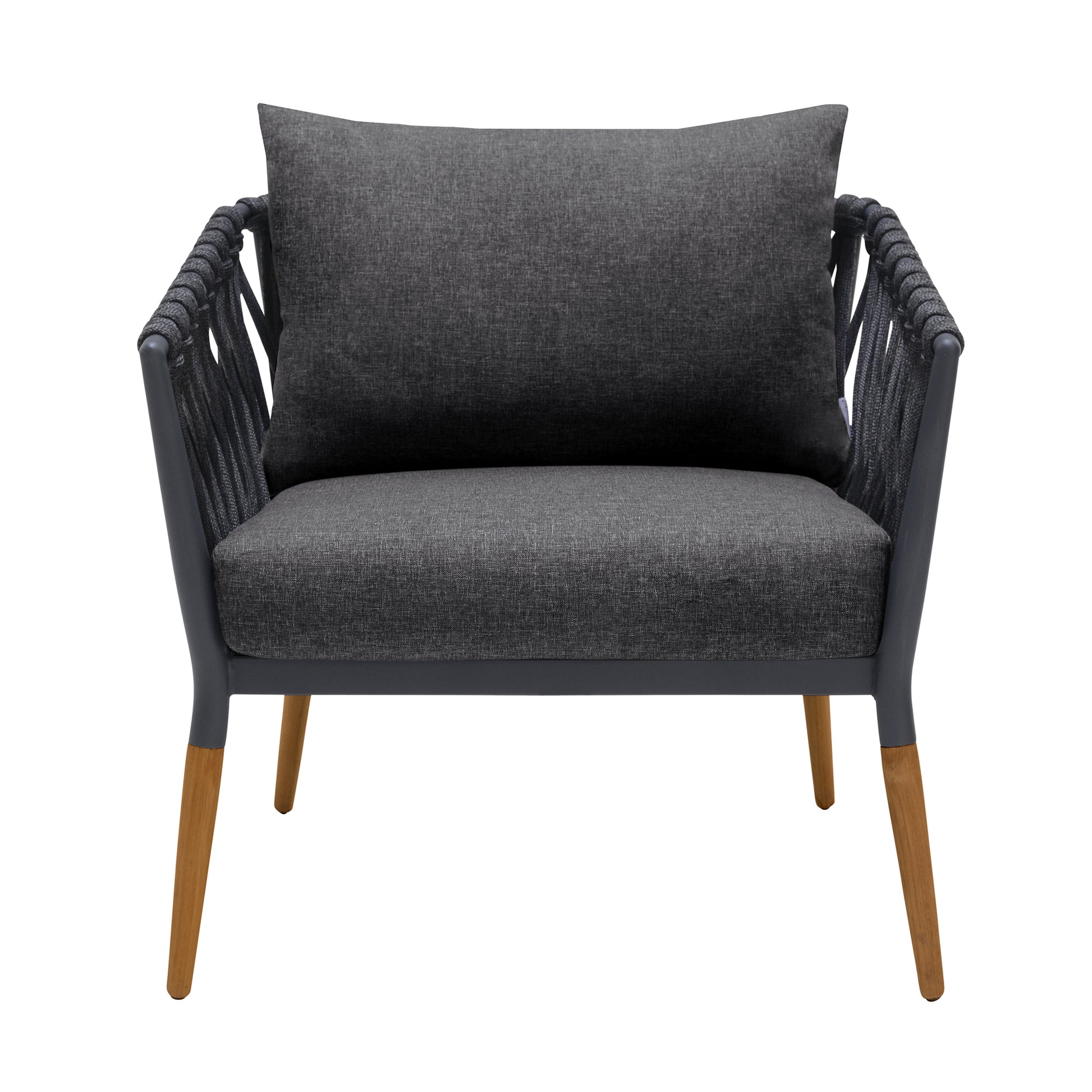 The Ipanema Outdoor Teak Wood and Rope Lounge Chair with Dark Grey Olefin from Armen Living is the next great addition to your outdoor living space. The enticing appearance of the dark grey olefin upholstery will be on an eye-catching display when you are entertaining guests. The solid aluminum frame is crafted to look sleek and superior, but also with weatherproof properties that will extend the life of this piece for many years to come. The Ipanema also features rope cording, which is made from strong olefin yarn, offering high performance in all weather conditions. It is handwoven by skilled craftsman to create seating that is sumptuous and supportive with a unique, eye-catchingly contemporary look. The rope will stay looking great with no maintenance. The convenient zipper closure on the cushions allows for easy removal for cleaning. Pair this sofa chair with the Ipanema Outdoor Teak Wood and Rope Sofa with Dark Grey Olefin or the Ipanema Outdoor Aluminum and Teak Wood Rectangular Coffee Table from the same collection! Product Dimensions: W:32 x D:30 x H:30 x SH:19