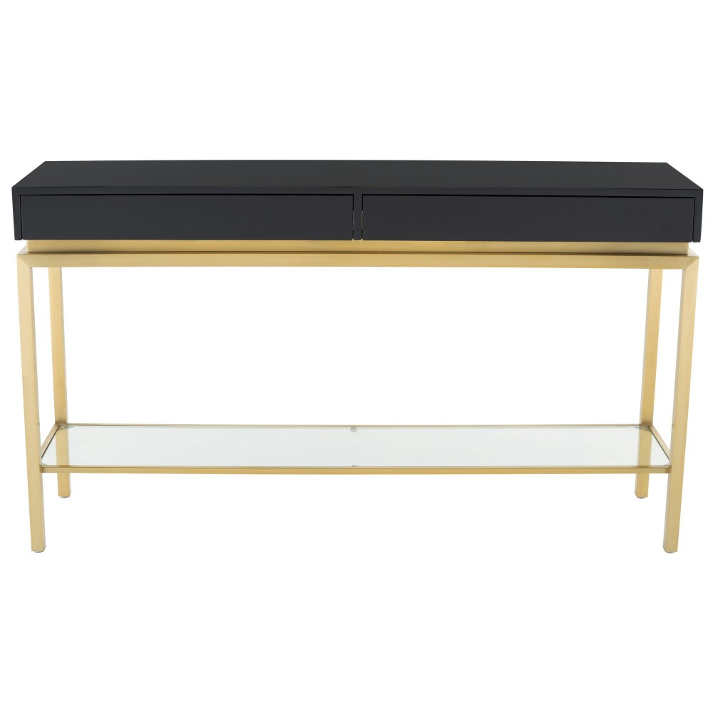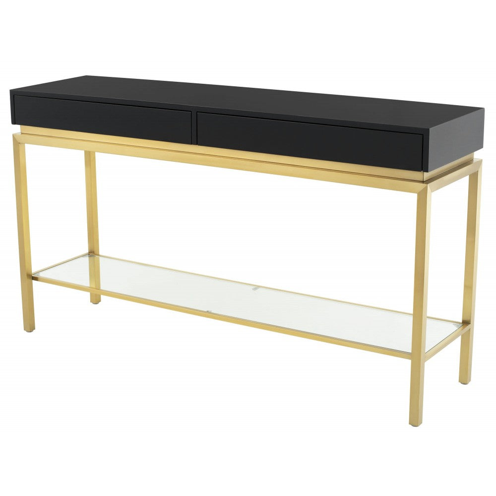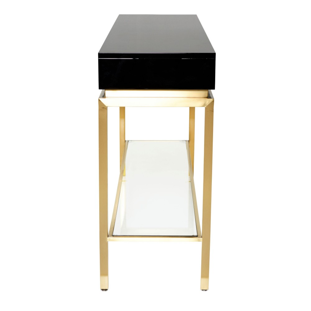 The refined, Isabella Console table flawlessly blends art deco and contemporary design. A brushed gold frame and floating tempered glass panel support a distinctive high polished black table top accommodating two concealed soft push drawers. The resulting aesthetic is one of lightness and sophistication.