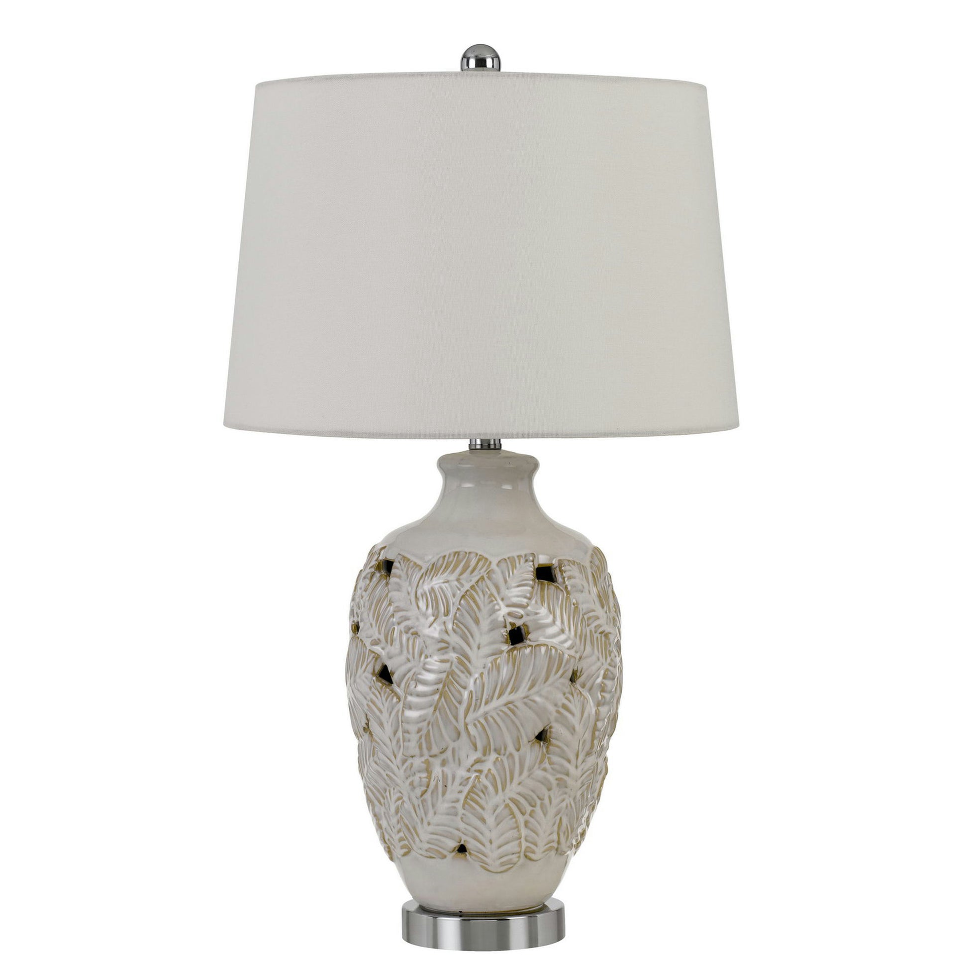 150w leland creamic table lamp with leaf design and taper drum hardback fabric shade