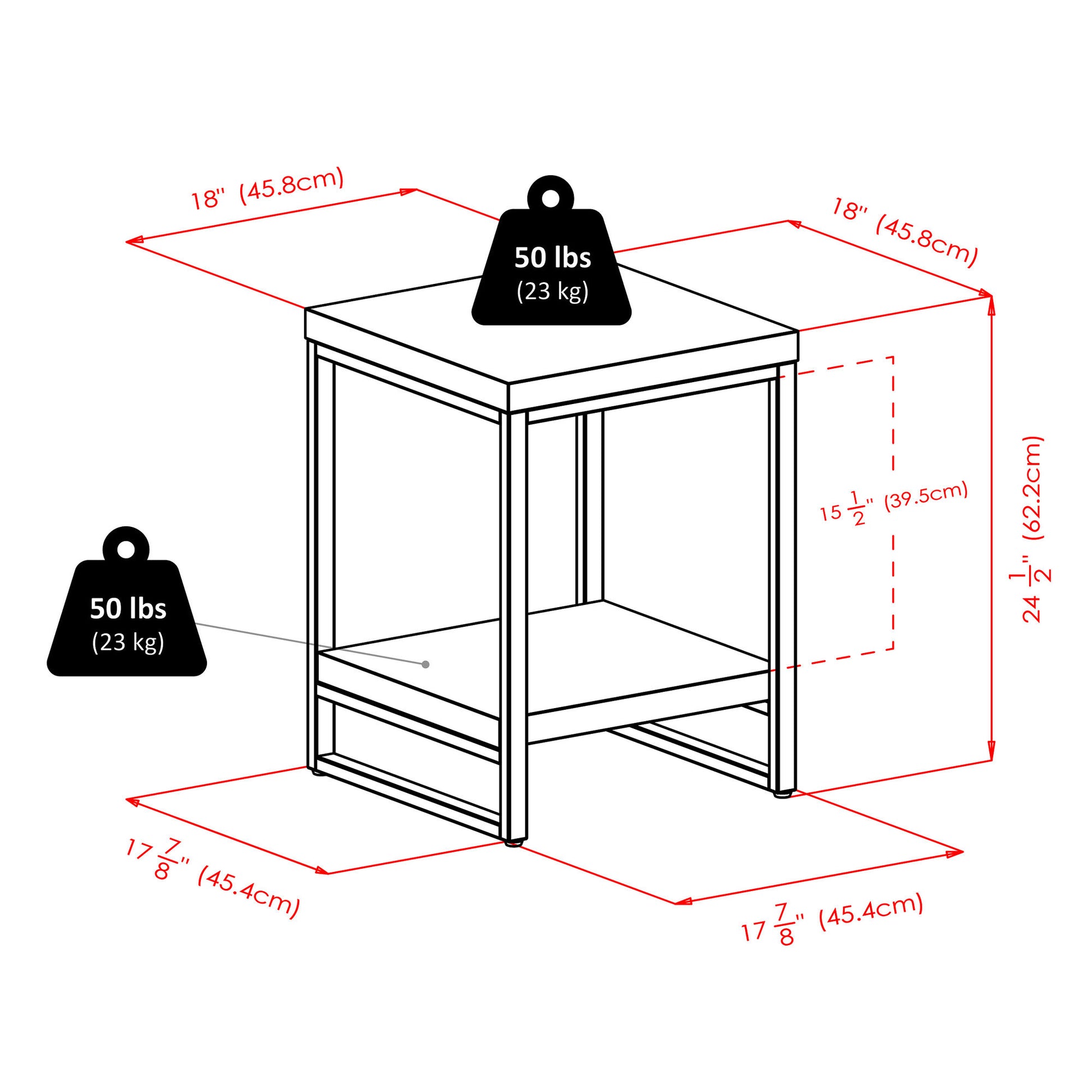- Overall End Table size is 18"W x 18"D x 24.50"H.