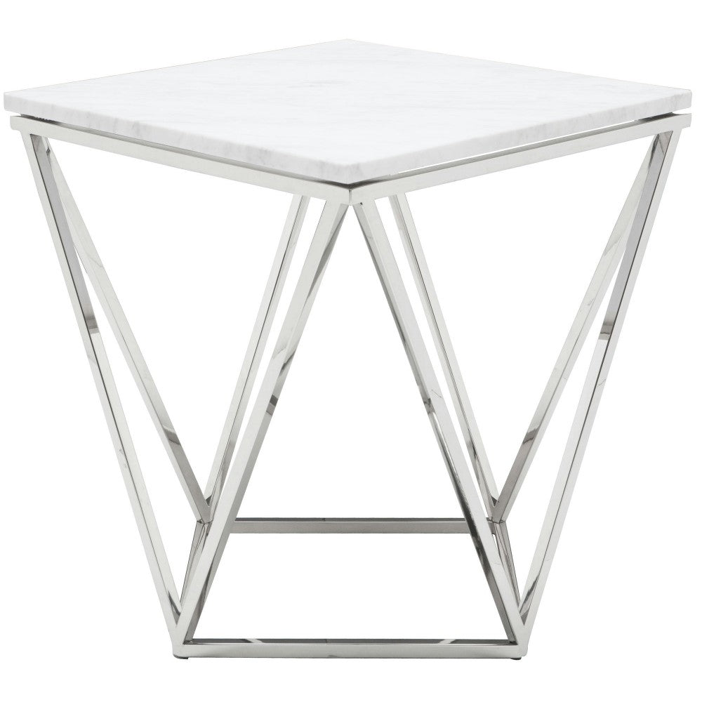 The Jasmine side table is notable both for its innovative design and structural grace. A solid marble tabletop rests on a delicate framework of squares and triangles in constructed polished stainless steel, inspiring a sense of lightness and refinement. Each piece of marble is expertly crafted out of a unique piece of natural stone, creating beautiful variations and one-of-a-kind details.