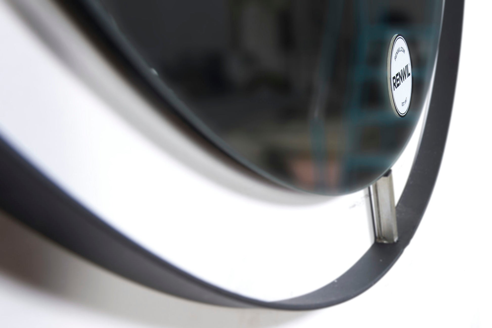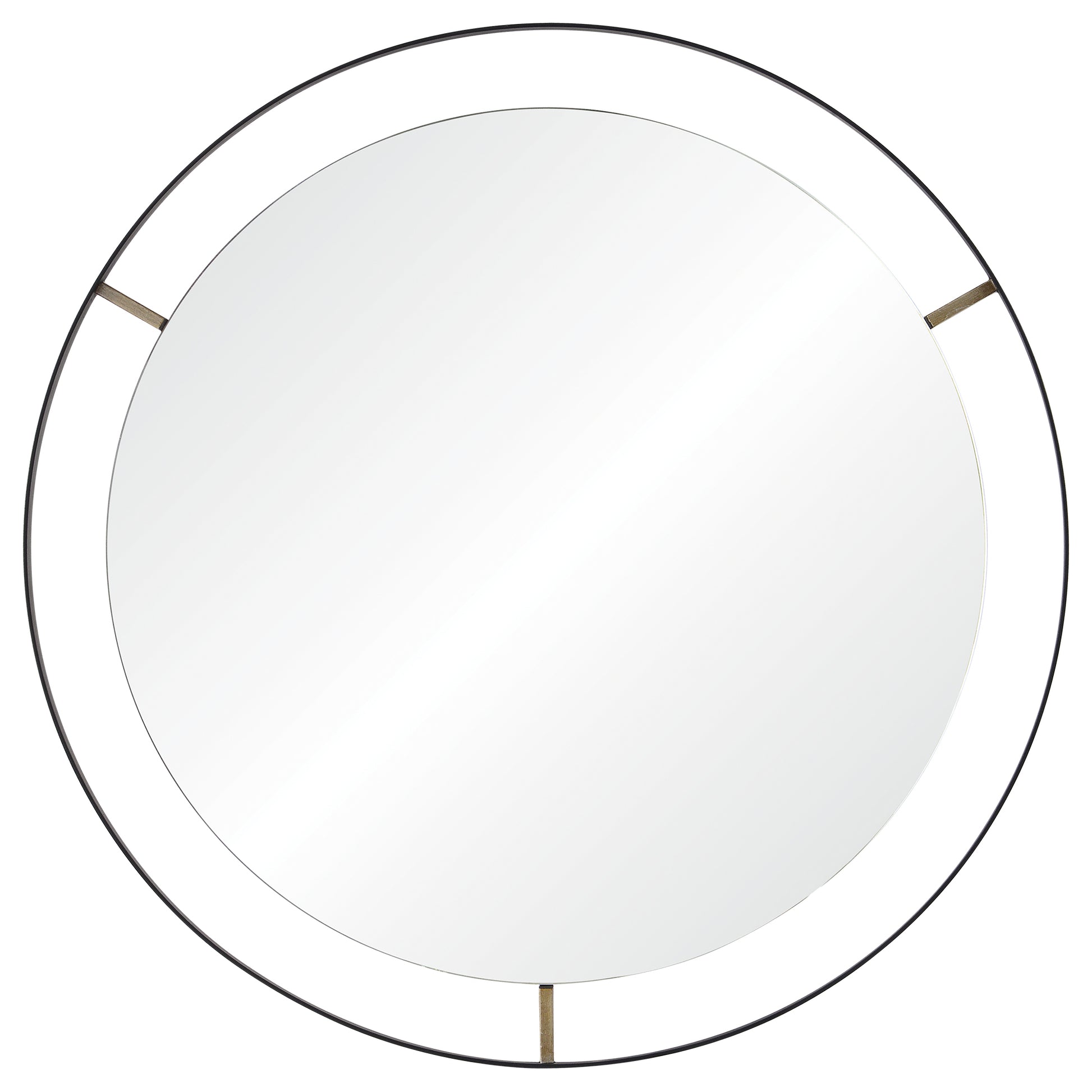 Semi-detached style makes this modern wall mirror ideal for rooms with retro design in mind. A circular looking glass seemingly floats in the center of the Matte black iron frame, secured to the round metal setting by antique brushed silver pins. An eye-catching accent piece for living rooms and entryways, this decorative wall mirror makes a stunning focal point above a couch or console table.