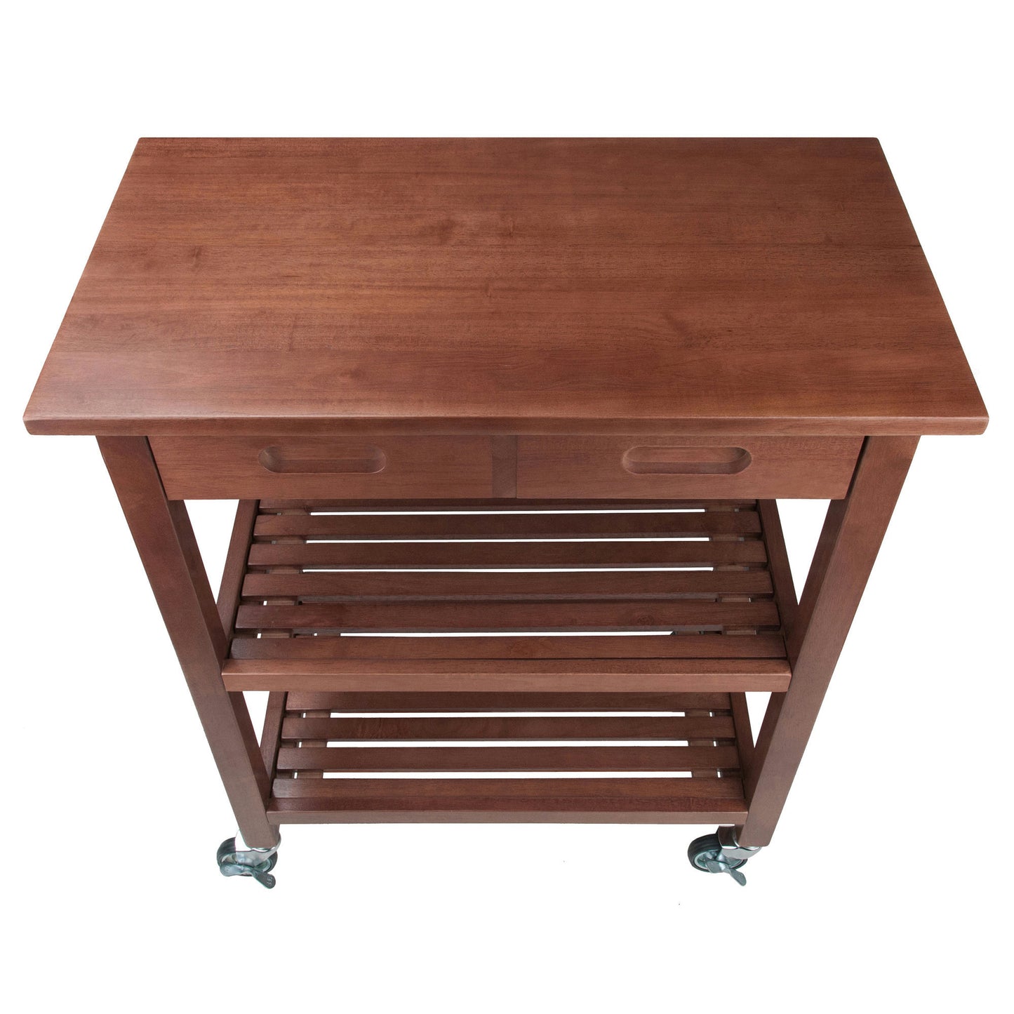 Rustic simplicity and function define that Jonathan Kitchen Cart. Handsome and durable, the cart features a drop leaf that adds extra work space when needed. With the drop leaf down, store the cart in a convenient spot. Two slatted shelves are ideal for kitchen utensils, serveware, mixing bowls, and more. Keep silverware and accessories in the drawers that have cut-out wood handles. The cart rolls easily on professional-grade casters, two of which are locking. Made of solid and composite wood in a rich Walnut finish. Overall size with drop leaf open is 28.2"W x 23.6"D x 33"H.