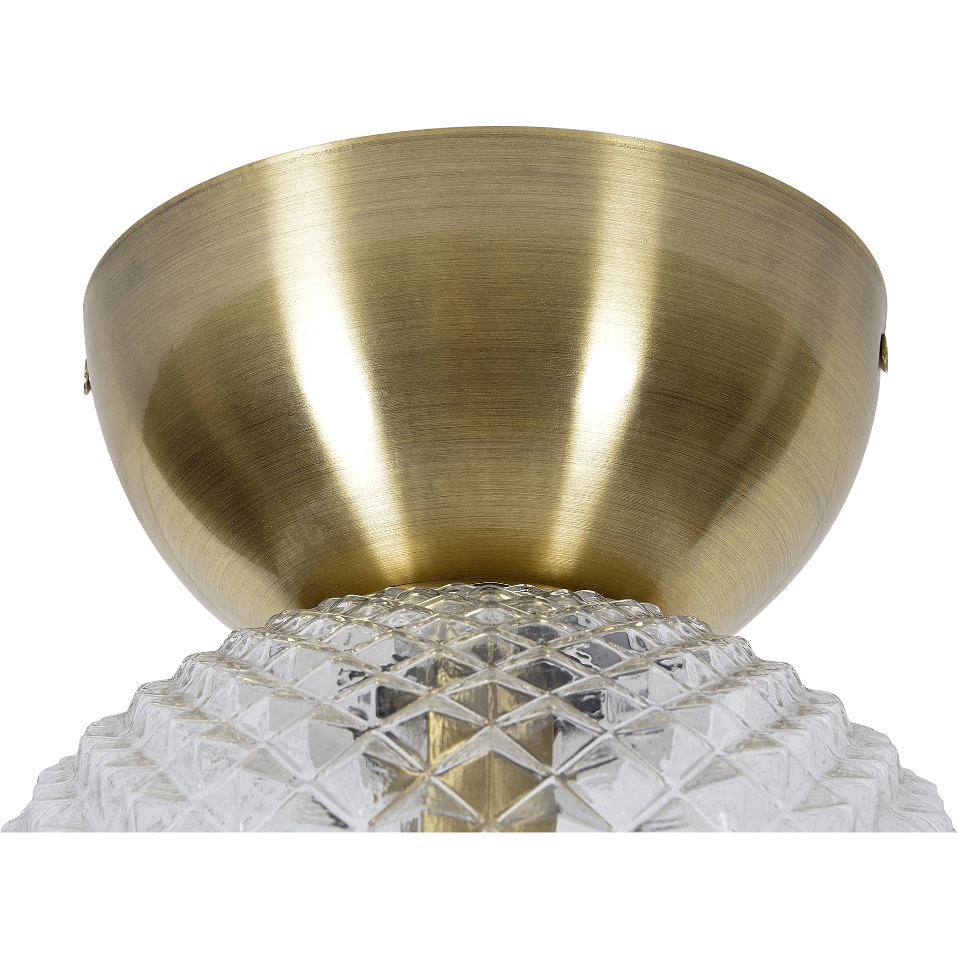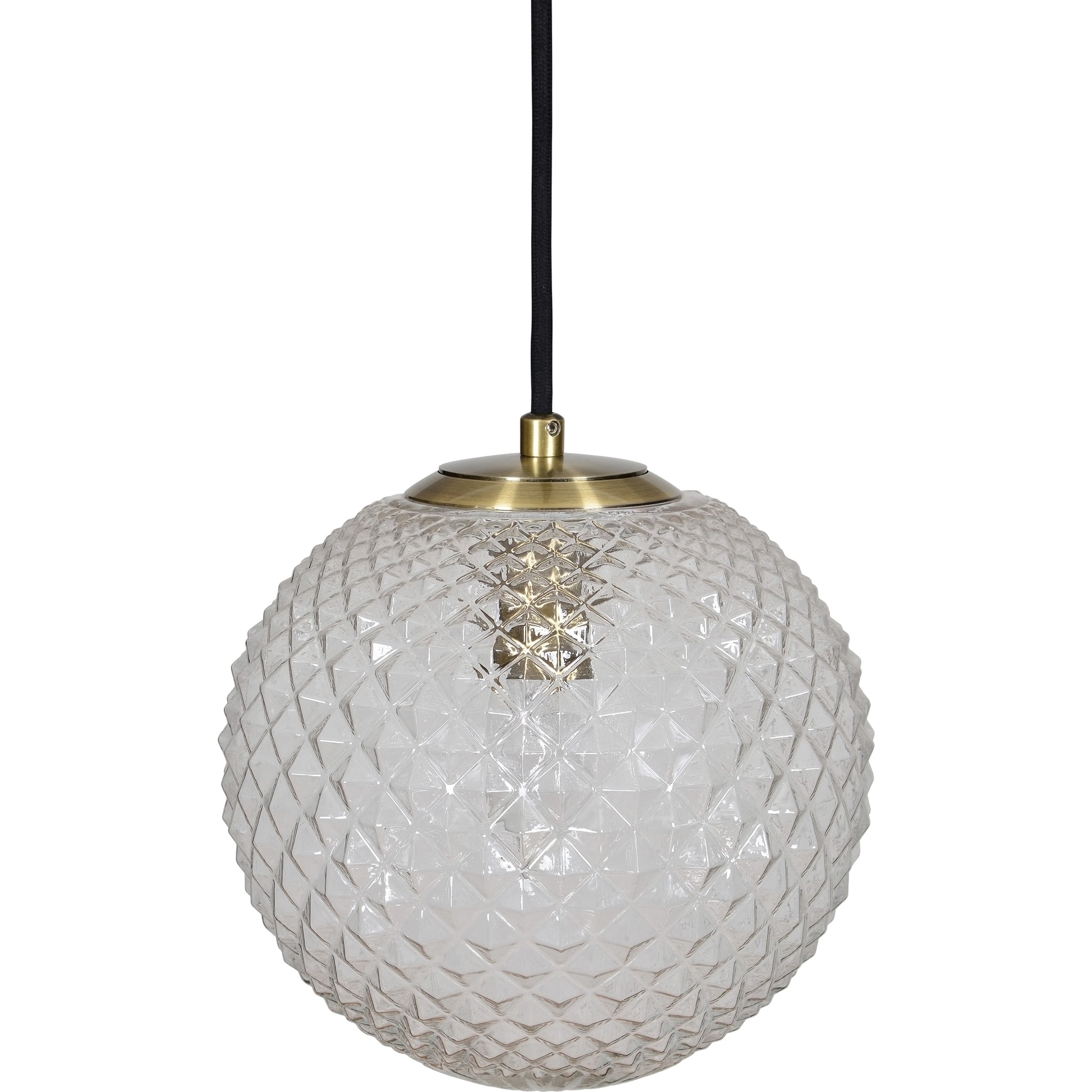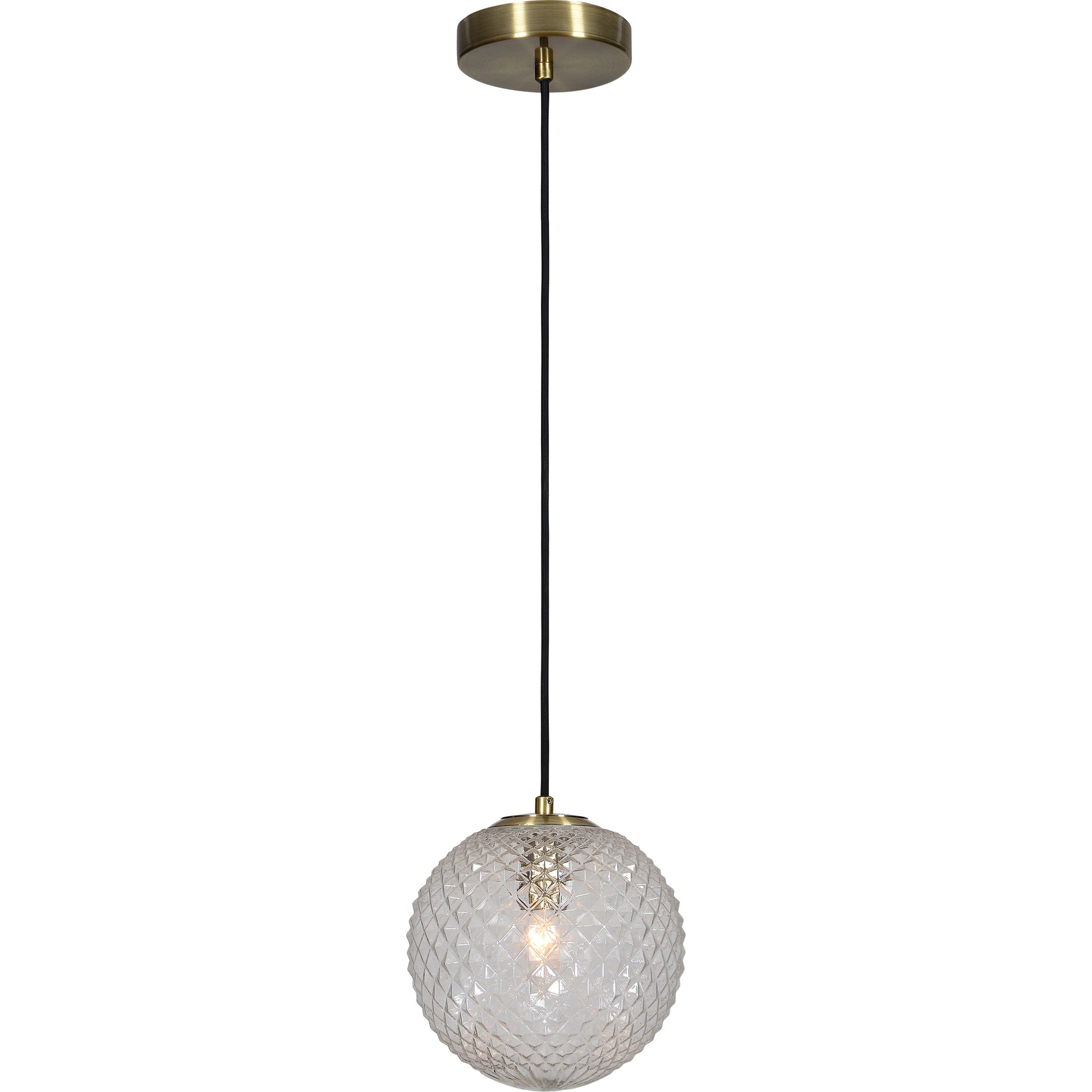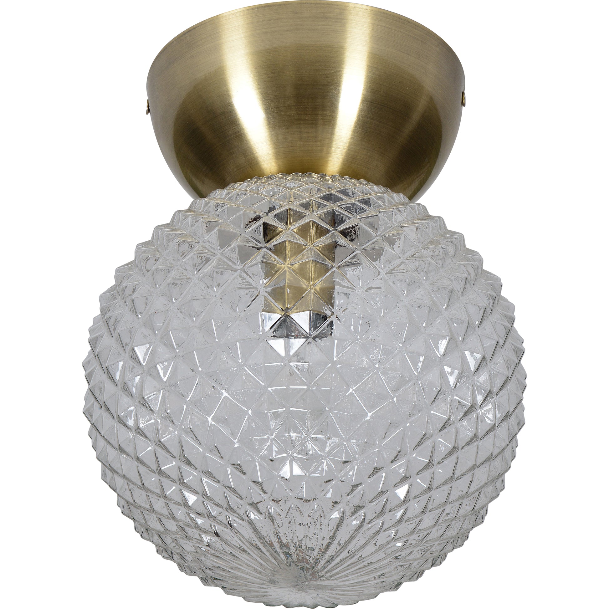 A focal point for the mid-century home, this captivating ceiling fixture fills the room with light. The warm energy of the plated antique brass finish on its iron structure is idyllically balanced by the glowing textured glass, surrounding the bulb. Its shape and size provides extensive opportunities for hanging arrangements.