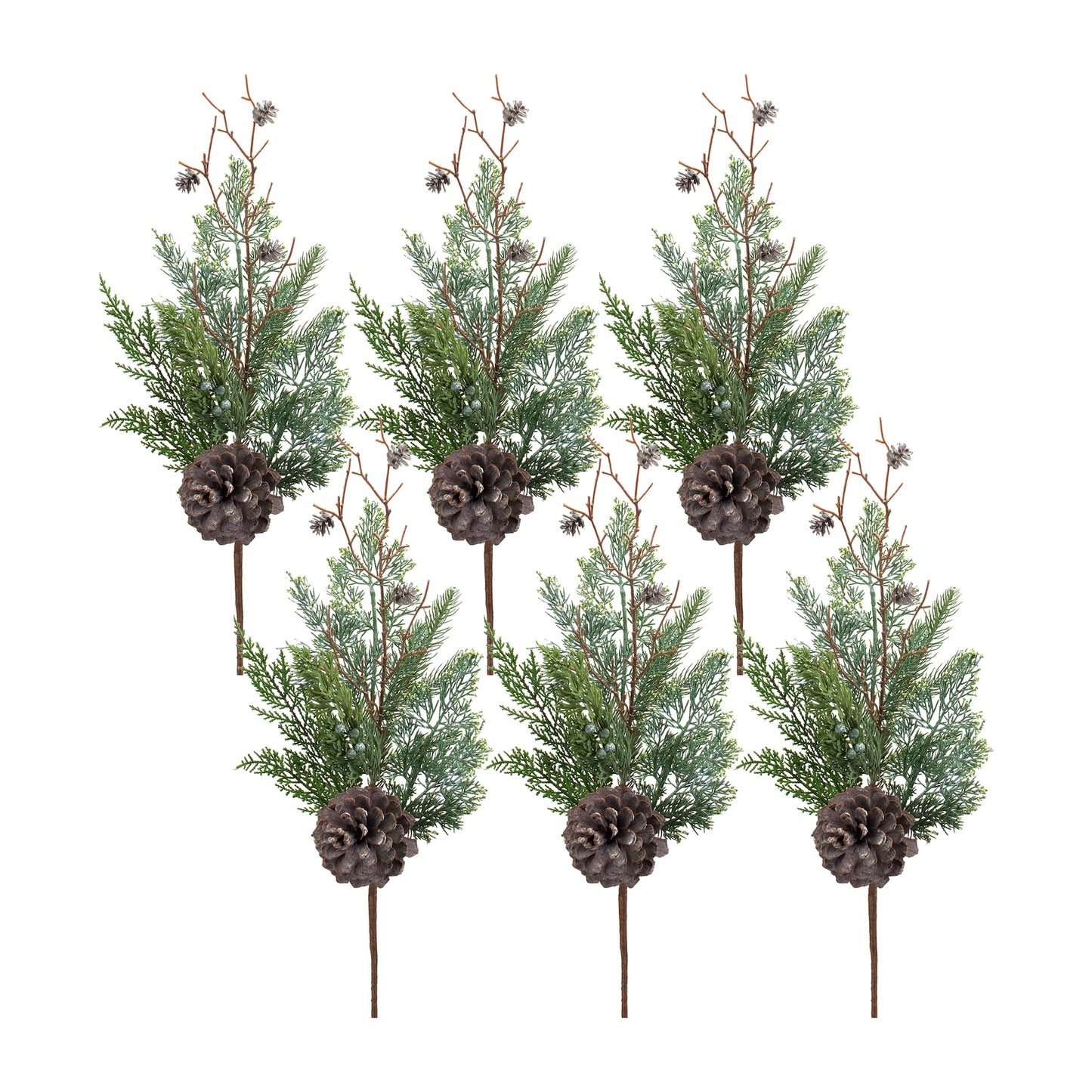 Ring in the holiday season with this beautiful set of Juniper and Pine Sprays. Featuring six pieces, this set would be a great addition to your Christmas centerpiece or table arrangement. The varigated juniper and pine foliage paired with the pinecone and twig accents is the perfect combination to create a stunning Christmas display. Add this set to a table vase to make a statement.