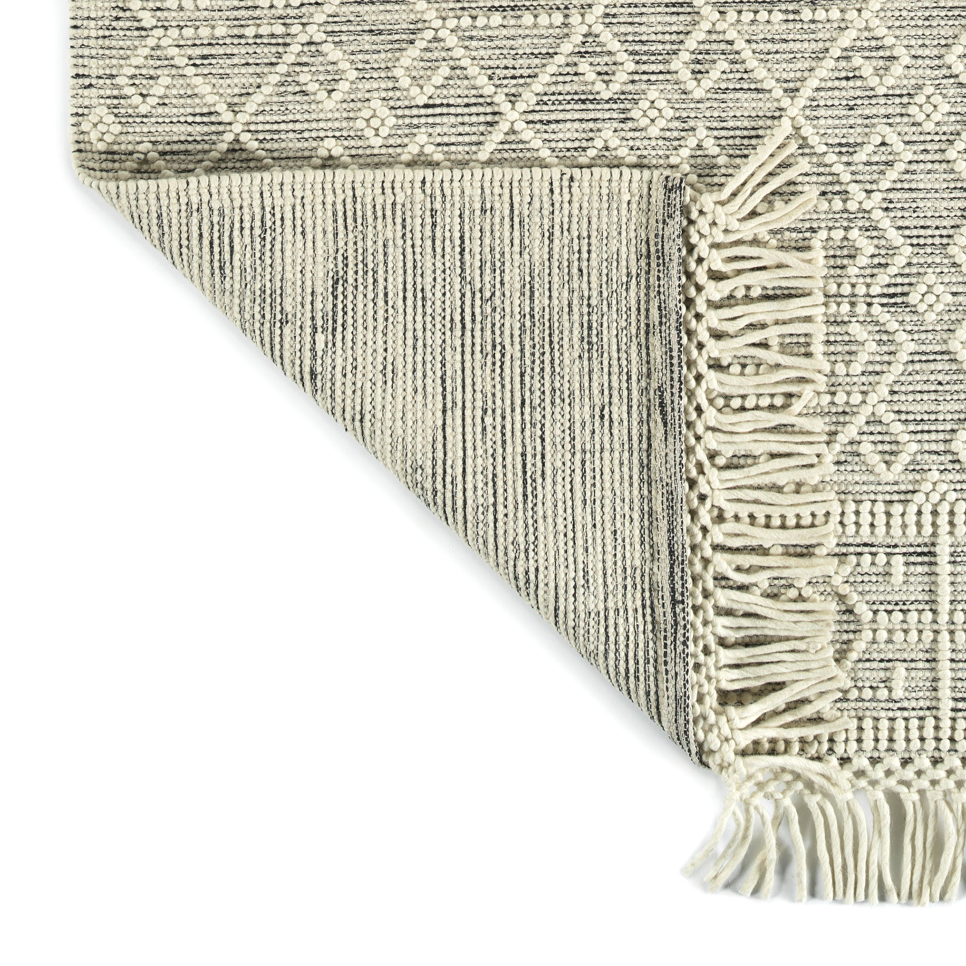 Simple and elegant, the Mara collection consists of a monochromatic lower pile with contrasting raised geometric detailing. These beautiful rugs feature a macromer type detailing and long oversized tassels. Hand loomed in India out of 100% blended wool the 4 designs of the Mila collection will add a sophisticated style to any room. Open-backed construction makes these rugs lightweight and easy to move from room to room.