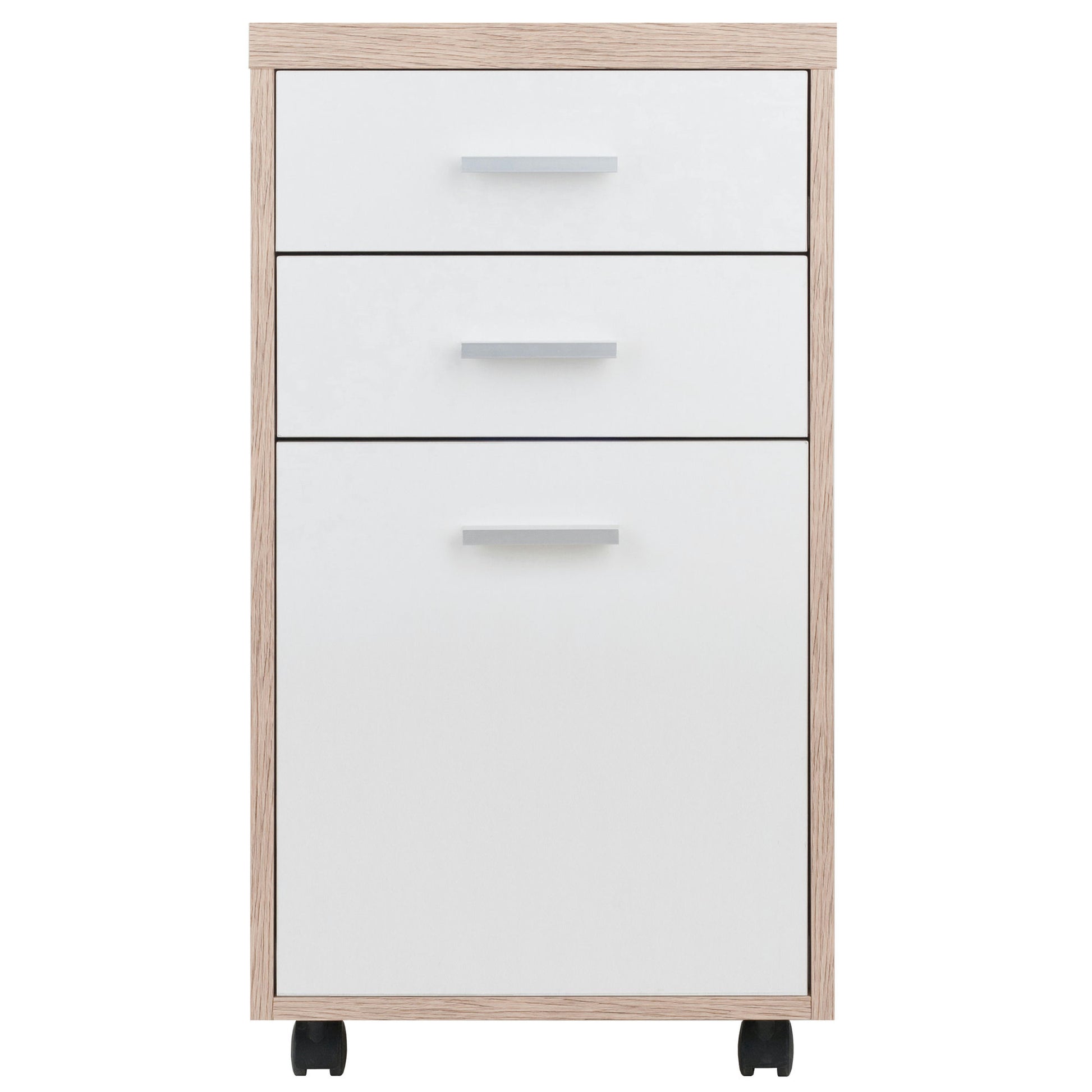 The Kenner 3-Drawer File Cabinet is practical and functional on its own or can be combined the Modular Desk Top and with any of the other Kenner Mobile Cabinets to create a customized office or storage console that works for you. The cabinet is made of durable composite wood with drawer facings in a contemporary, linen white finish. The unit moves easily on casters, two of which lock.