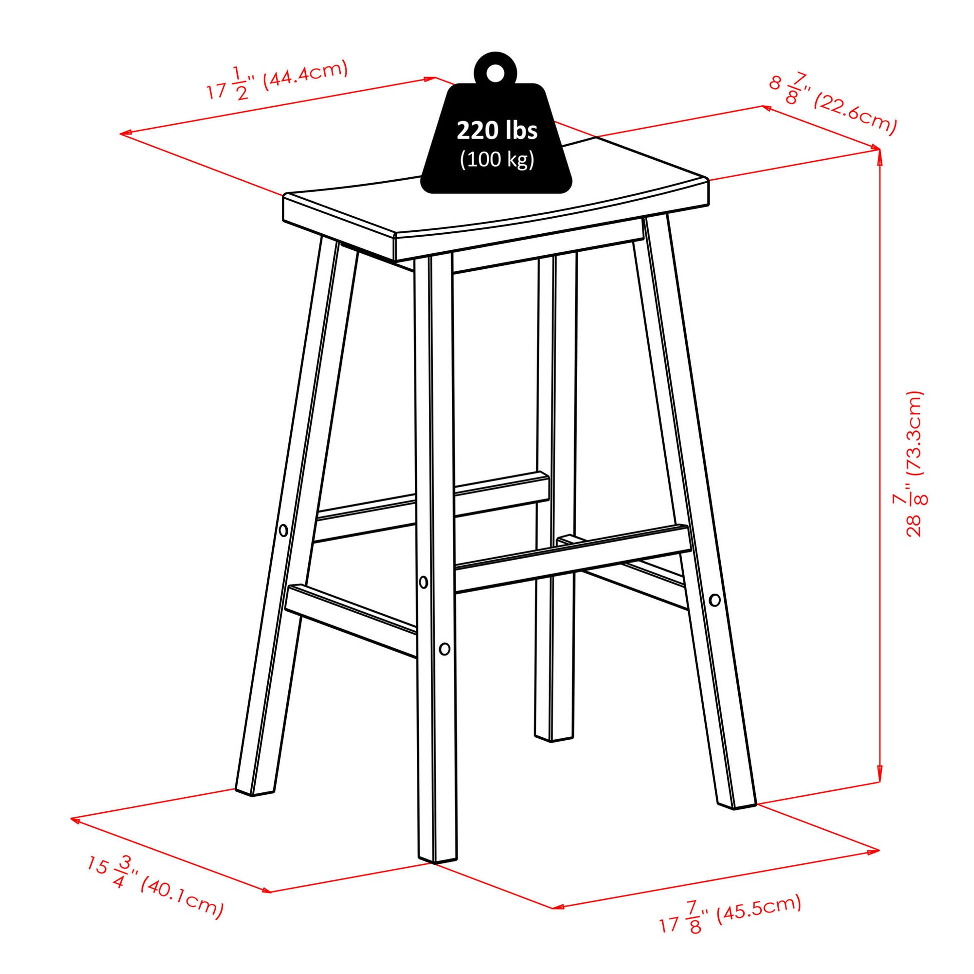 - Includes 2 Assembled Bar Saddle Seat Stools 17.91"W x 15.79"D x 28.86"H; Seat dim. 17.50"W x 9"D.