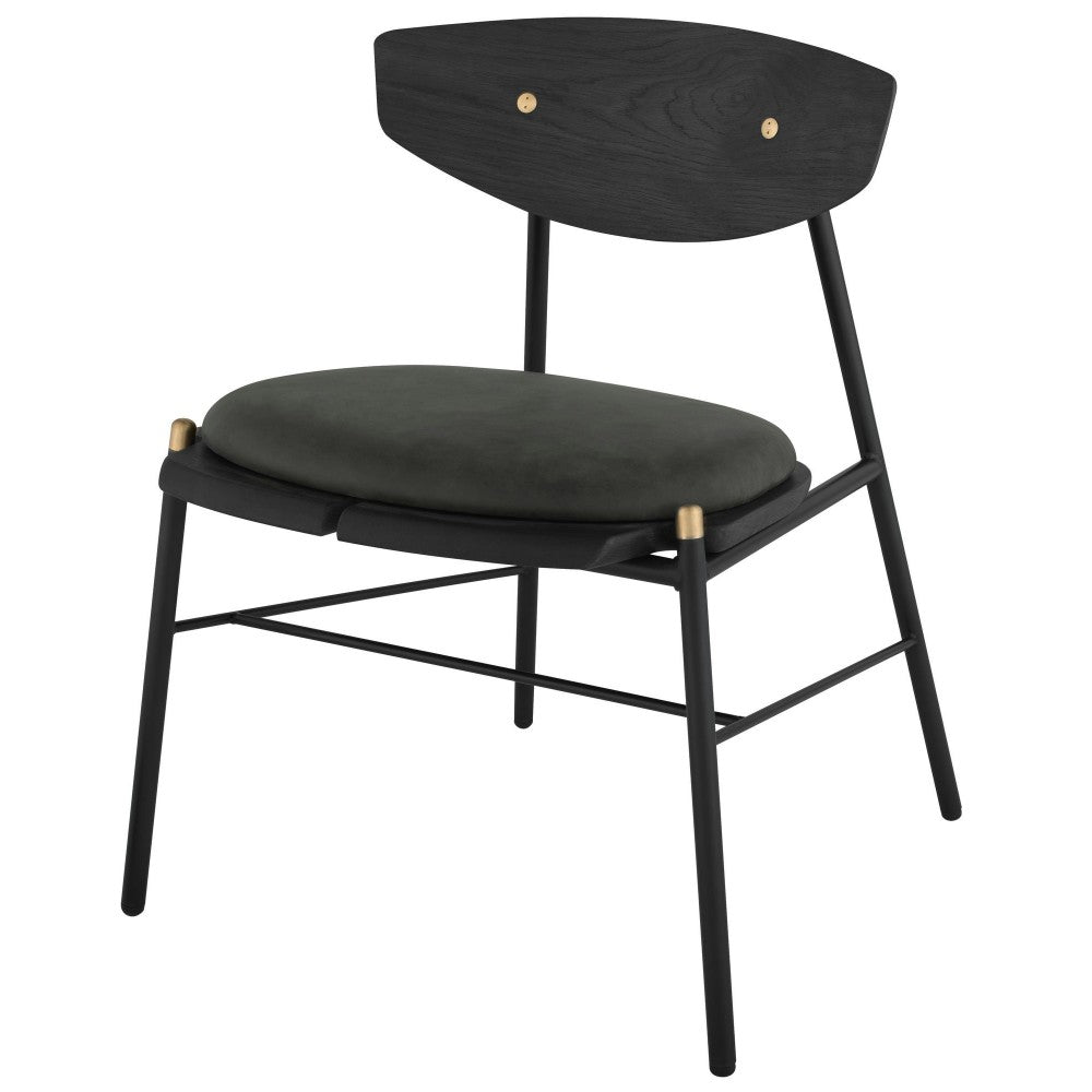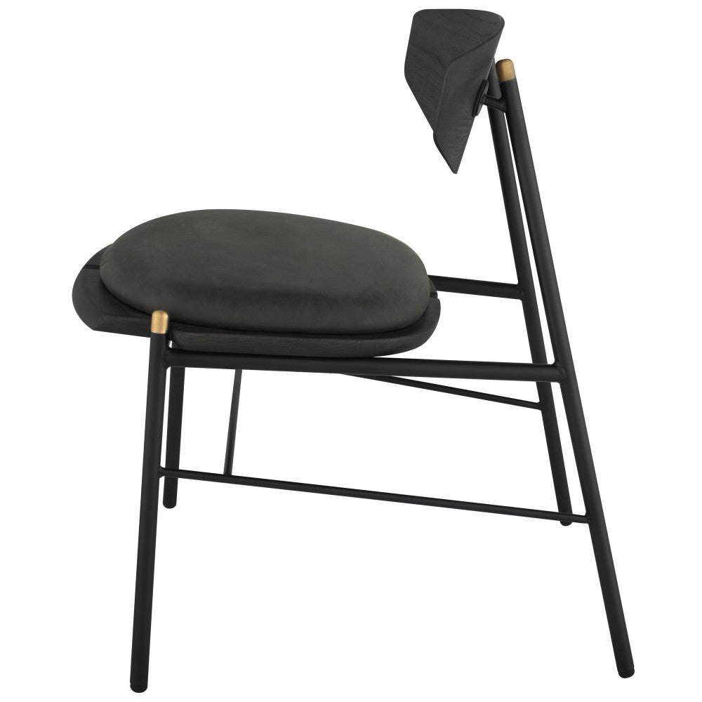 The Kink Dining Chair shows a unique aesthetic in chair design, modernizing industrial materials with its curved composite / veneer backrest, solid oak seat and steel frame with brass features. Seat options include solid oak and leather.