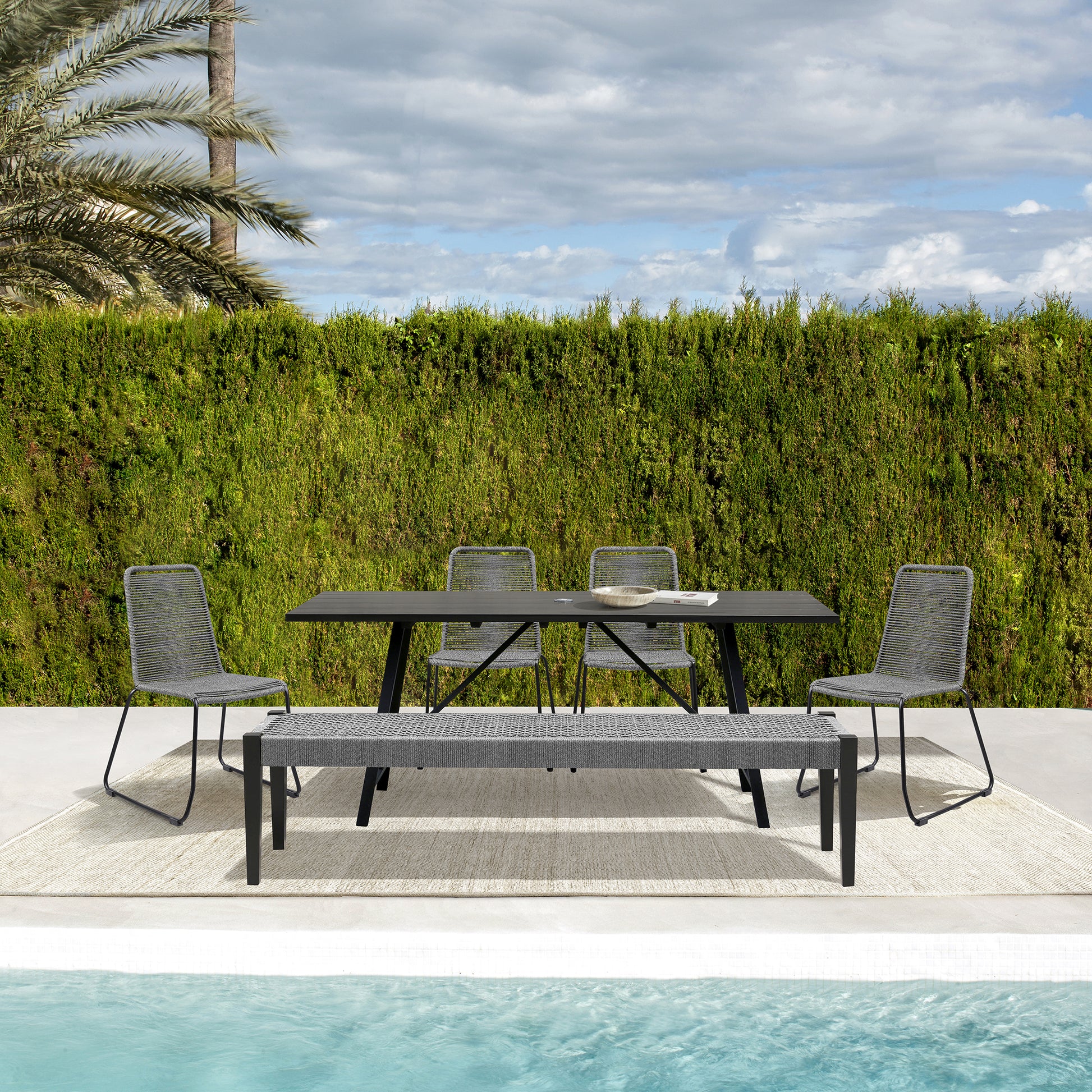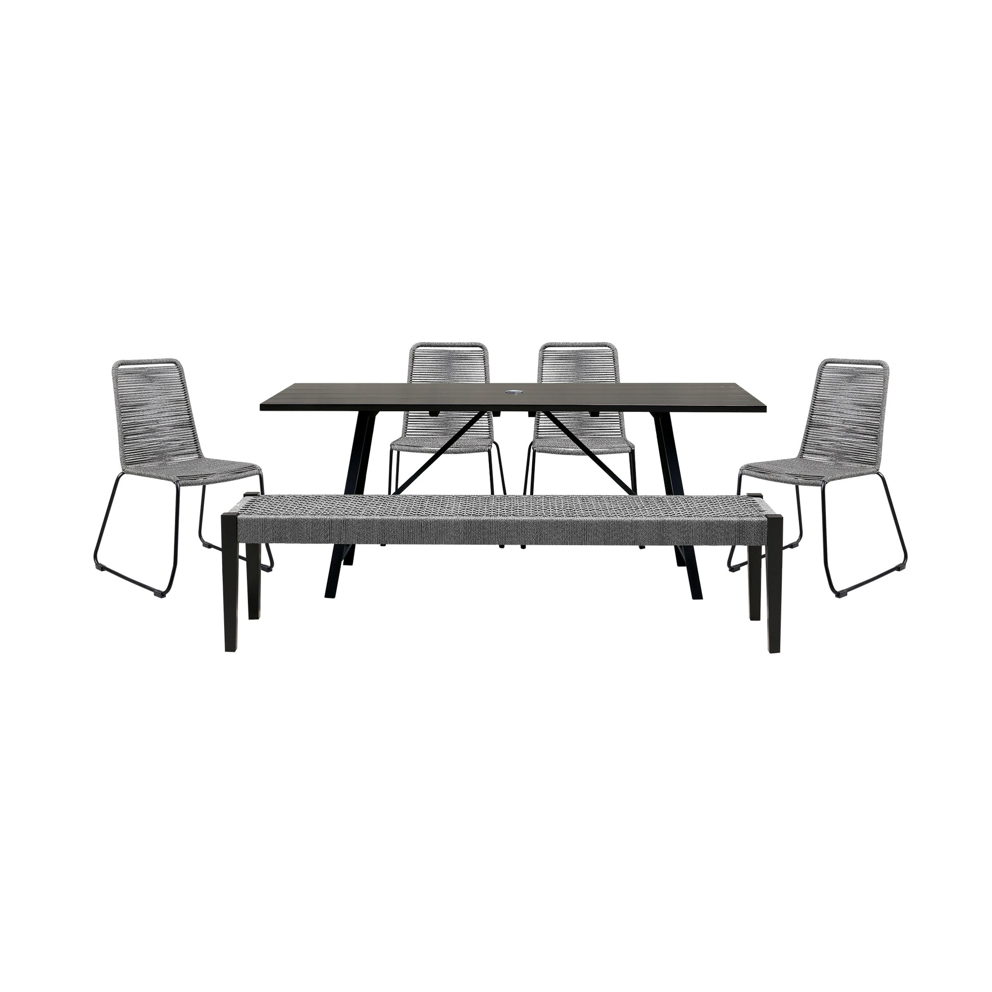 A cohesive indoor and outdoor experience is complete with the Koala Shasta and Camino 6 Piece Outdoor Dining Set from Armen Living. This dining set features 1 Koala Dining Table, 4 Shasta Dining Chairs, and 1 Camino Dining Bench. Modern and inviting, our patio dining table combines the warmth of wood with the hardiness of metal. The clean-lined and minimal profile of the table can effortlessly blend and compliment any outdoor space. One of the best reasons to choose Eucalyptus wood for your outdoor furniture or four-seasons porch is that it is exceptionally resistant to decay and rot. It naturally resists the influence of moisture because of the high oil content it naturally contains. That means it can get damp without you worrying about whether damage will occur. It can withstand several different outdoor elements while lasting for many years if it receives proper care. The Koala’s trestle base allows for maximum seating space as it makes the table virtually legless and allows for the full surface of the table to be used and no corner legs that would limit dining chair space. The intricately woven rope featured on the durable metal frame of the Shasta dining chairs form to offer you extreme comfort and relaxation. This outdoor chair is wrapped in resilient regatta rope cording, providing supple support while still allowing for element passthrough - also enhancing your seating experience with a softness that rivals most fabrics. Each chair is made with the best craftsmanship, with these chairs standing on top of durable metal legs in a black finish for a modern look. For use indoors and out, the soft UV coated nylon cords are hand dyed resulting in subtle tonal variations. The 71-inch-wide Camino dining bench features a unique rope weave which also allows for easy drying if it happens to get wet. The combination of rope and eucalyptus wood offers warmth and texture.