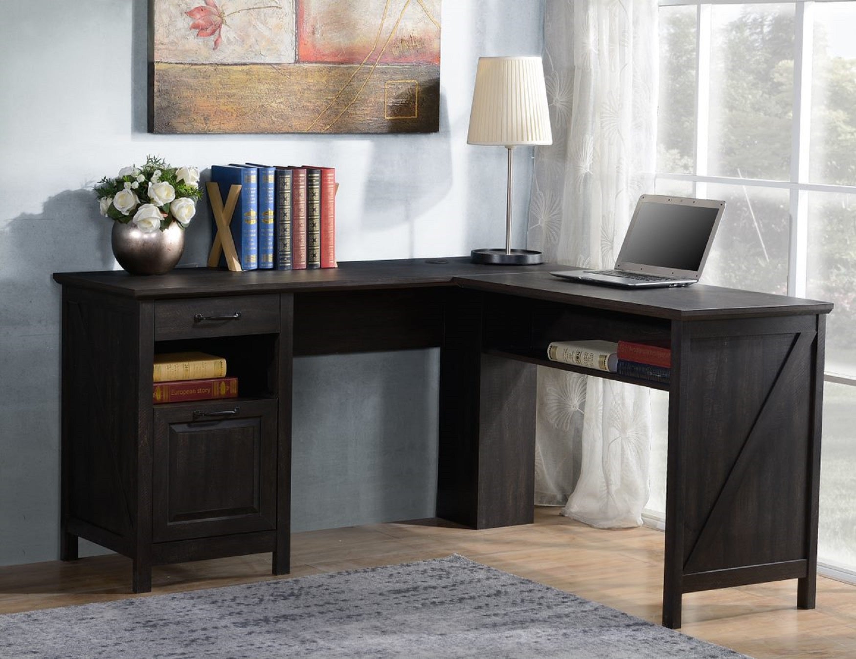 This beautiful Black Oak finish Corner L Desk is sure to make the perfect addition to any home office or workspace. Two large desktops ensure ample space for work and monitors or laptops. The file drawer is perfect for organizing important documents and the strorage drawer and cubicle give plenty of extra storage for office supplies