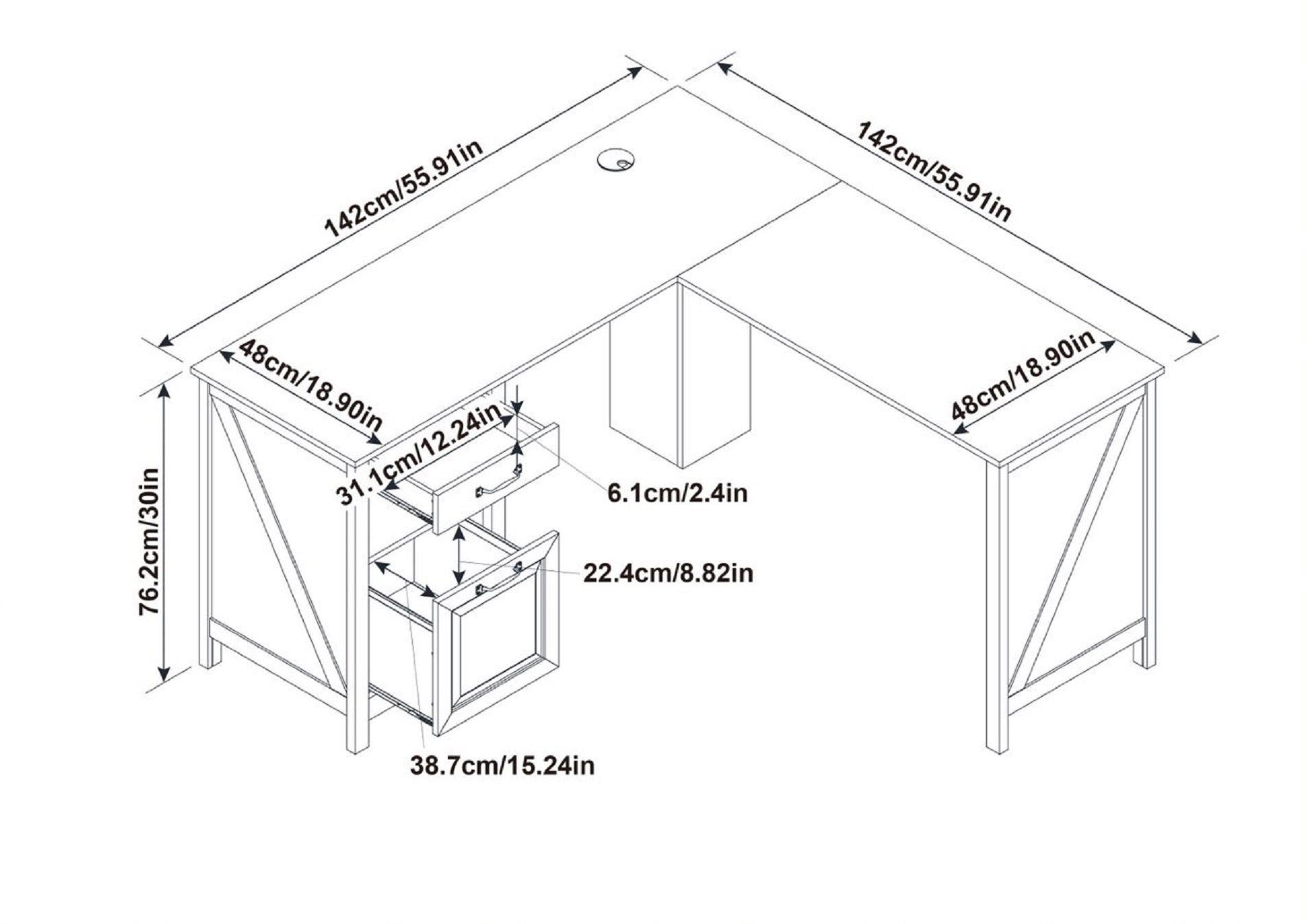 - Spacious L shaped desk work surface provides room for you to spread out and multitask.