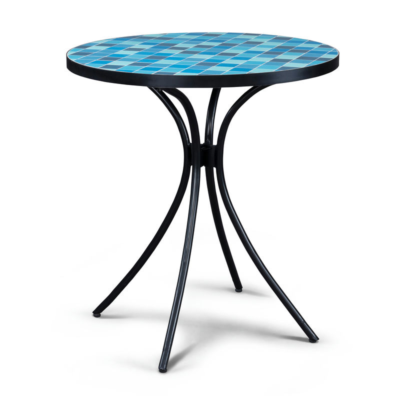 This Larimar dining table features an ocean-inspired mosaic of blue, white and grey tiles, each applied by hand to make every top truly unique. A metal edge protects the tile surface, while a powder-coated metal frame creates a sturdy foundation.