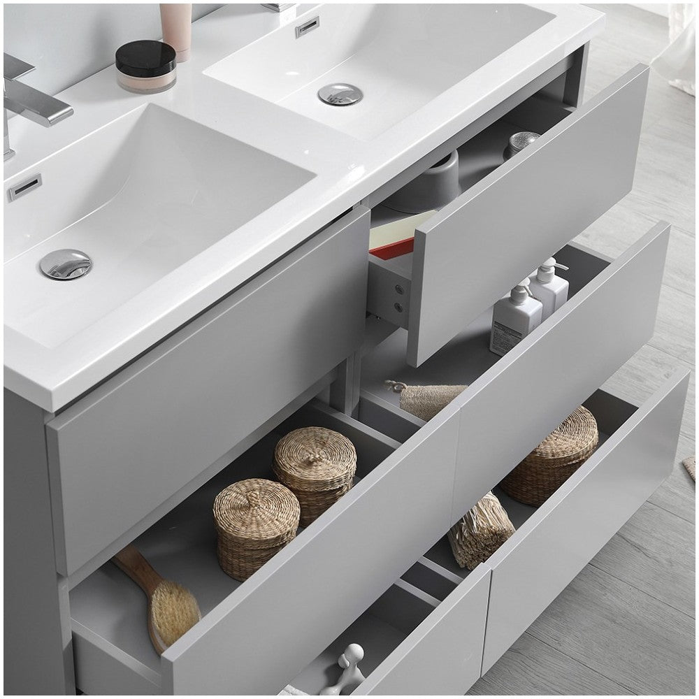 With its chic Gray finish, the Fresca Lazzaro Freestanding Modern Bathroom Cabinet with Integrated Double Sink is the ideal combination of style and function. Six spacious soft-closing wood drawers offer wonderful storage space, perfect for keeping all of your daily essentials out of sight and the family organized. The drawers feature push-release hardware, offering a streamlined front that beautifully complements the minimalist design. Gracing the top of the cabinet is an eye-catching white acrylic-resin countertop/double sink with smooth edges and integrated overflow. The sinks have been pre-drilled to accommodate single hole faucets (sold separately). This modern cabinet with integrated double sink will enhance any decor and is available in multiple sizes and finishes. It includes installation hardware