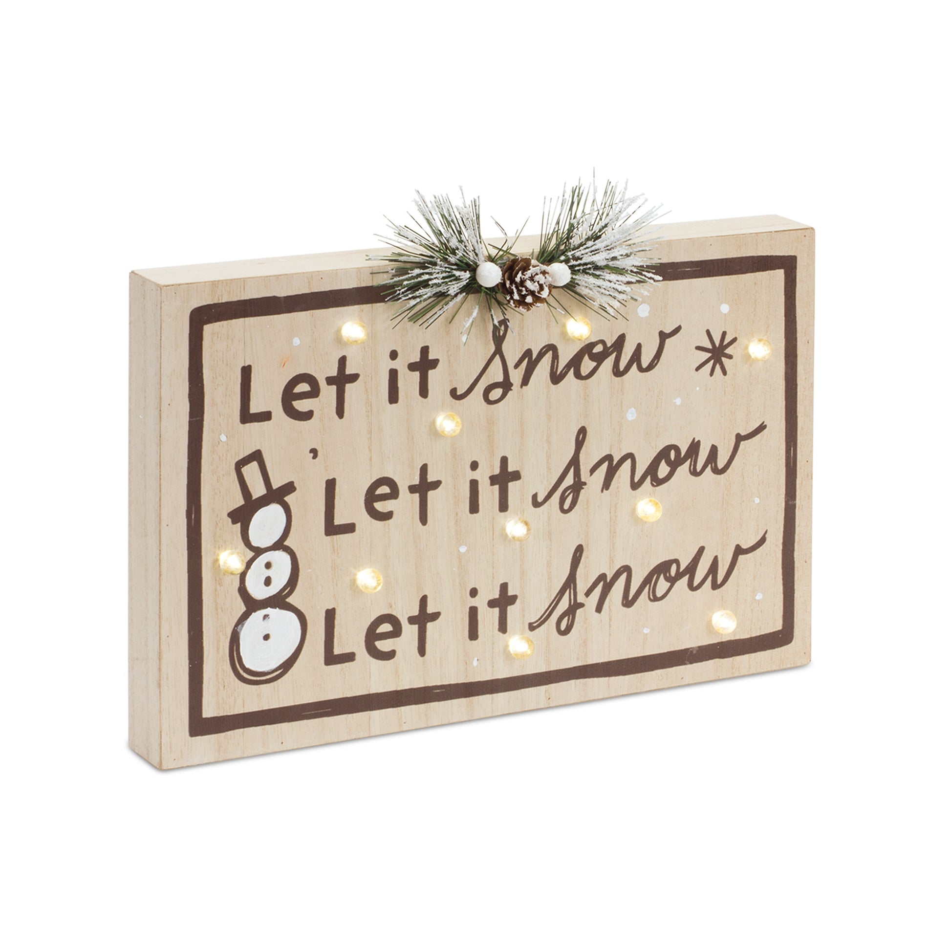 Ring in the holiday season with this beautiful set of LED Holiday Signs. Featuring the sentiments "Home for the Holidays" and "Let it Snow", the faux wooden finish paired with the brown script and pine accent makes this set a great addition to any style of holiday decor. The quality MDF composition is sure to last for seasons to come. Display the pieces together to make a statement, or display them alongside your other holiday decor to add character to the space. Requires 6 AAA batteries (not included).