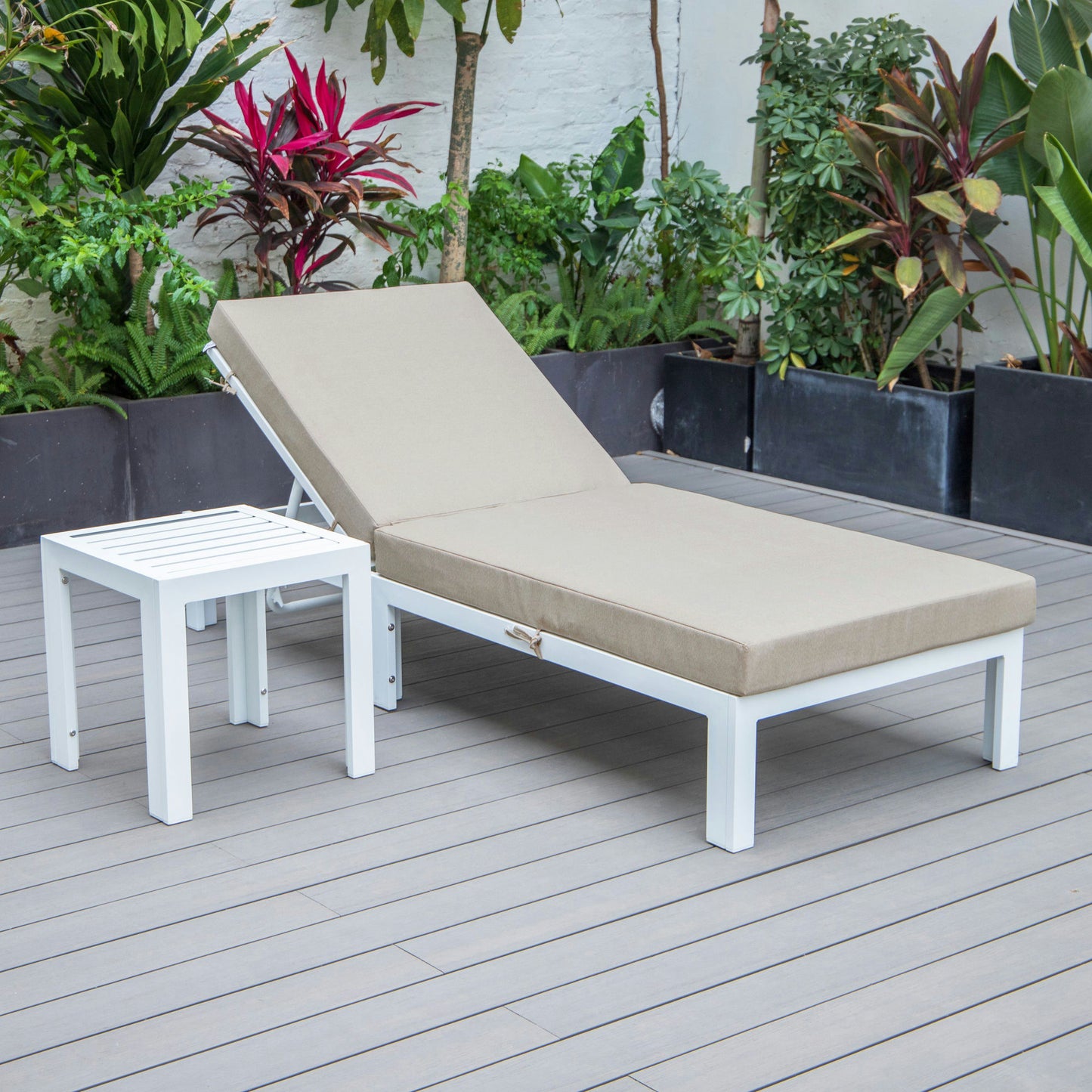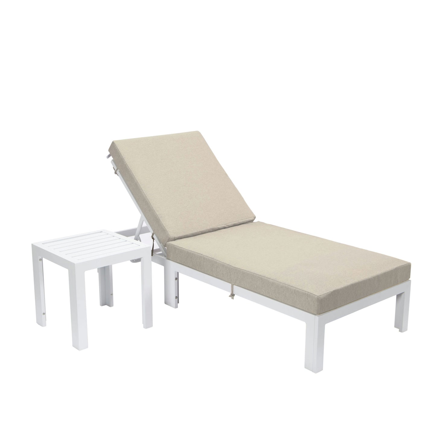 LeisureMod Chelsea Outdoor White Lounge Chair With Side Table & Cushions - Beige