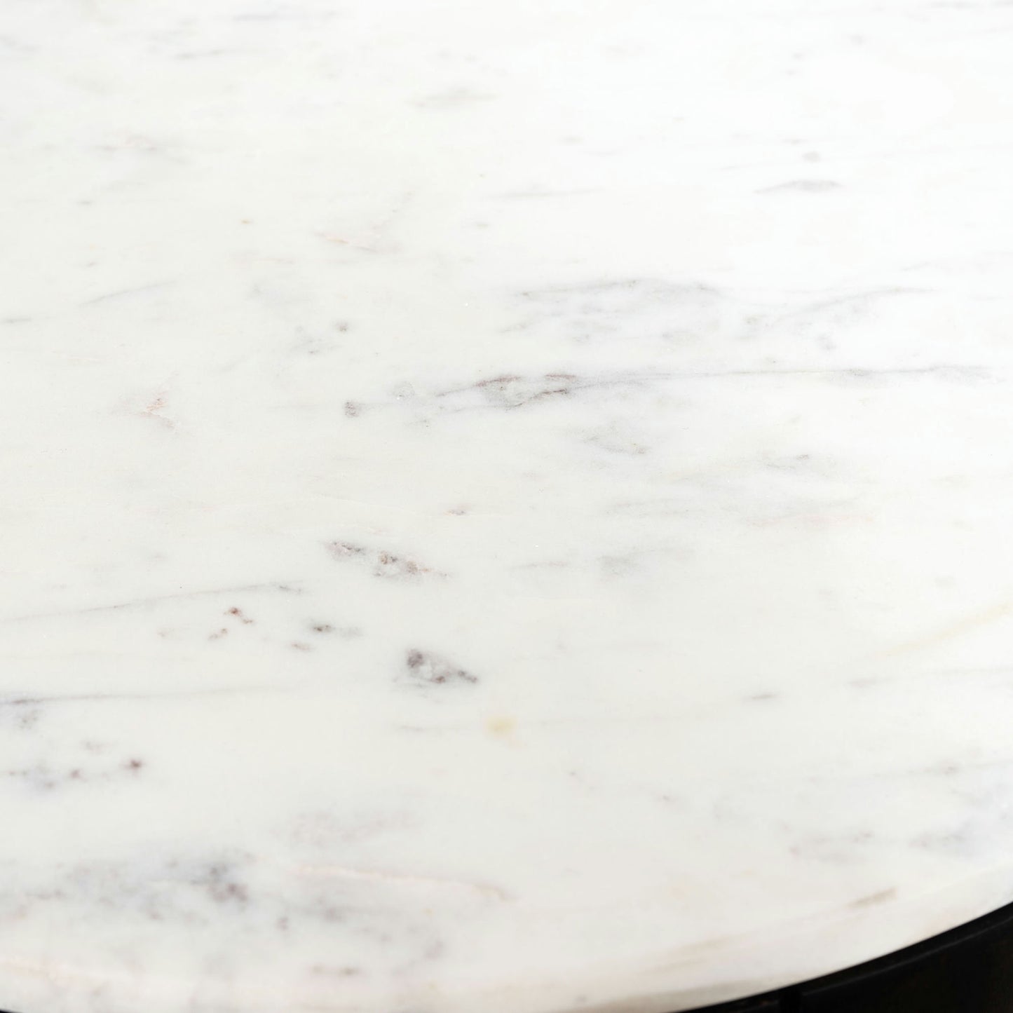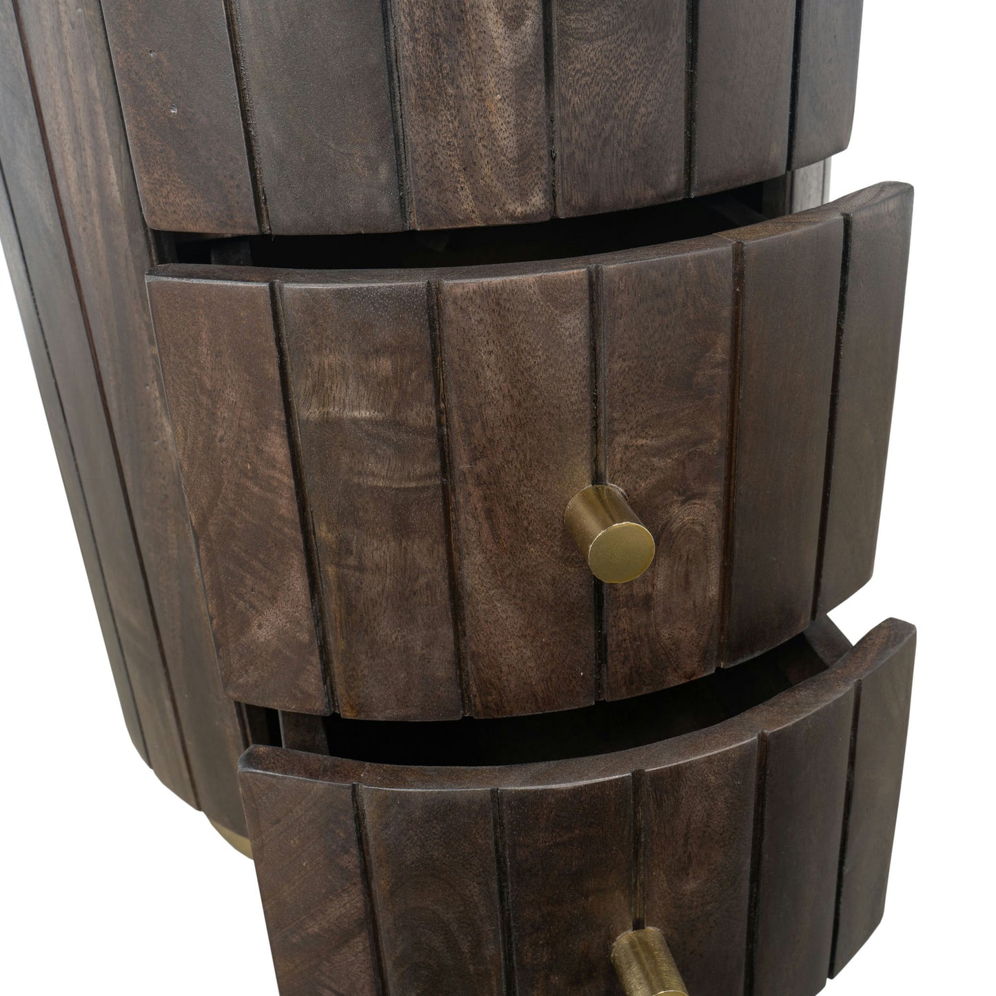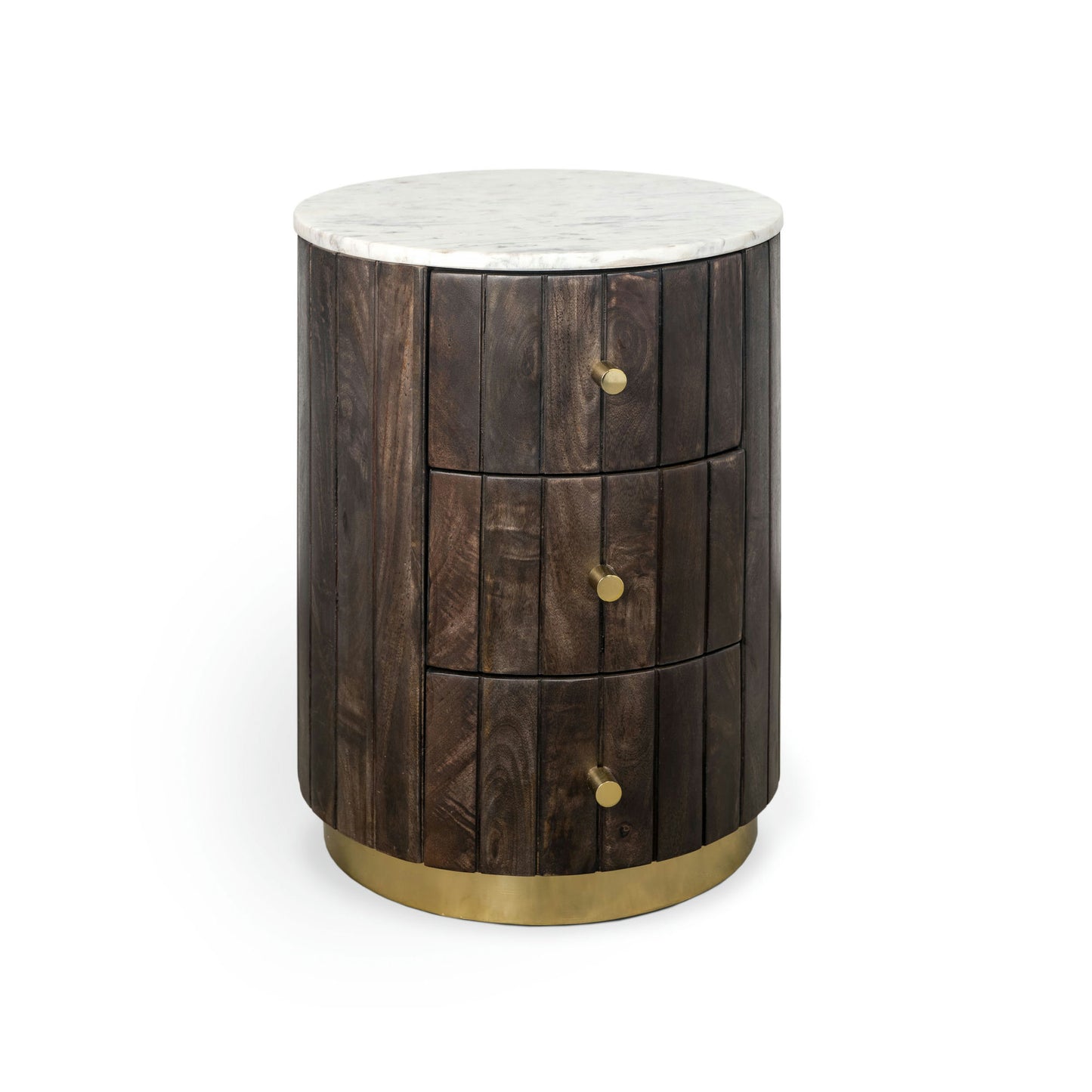 Rejuvenate your space with this modern wood circular side table boasting clean lines and practical low profile contemporary design. Crafted from solid mango wood, it features a sleek marble table top and gold metal hardware and base. This piece is designed with storage in mind and has three drawers to provide ample hidden storage