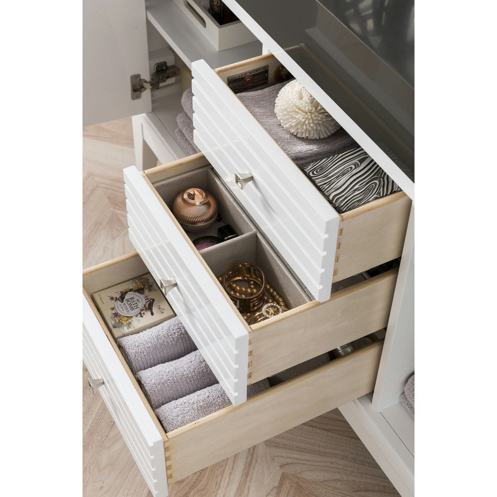 The Linear 59" Double Vanity with Glossy White finish features spacious storage options with two doors, two shelves, and three drawers. Cabinet exterior is made from solid Birch and Poplar, highlighted by clean lines and satin nickel finish knobs. Premium features include one faux shagreen in-drawer organizer and one 120 Volt UL rated electrical component with two electrical and two USB (2.0) outlets. The look is completed with a Dusk Gray Glossy composite integrated top and sink. The recessed interior drawer is designed to only extend and open half way.