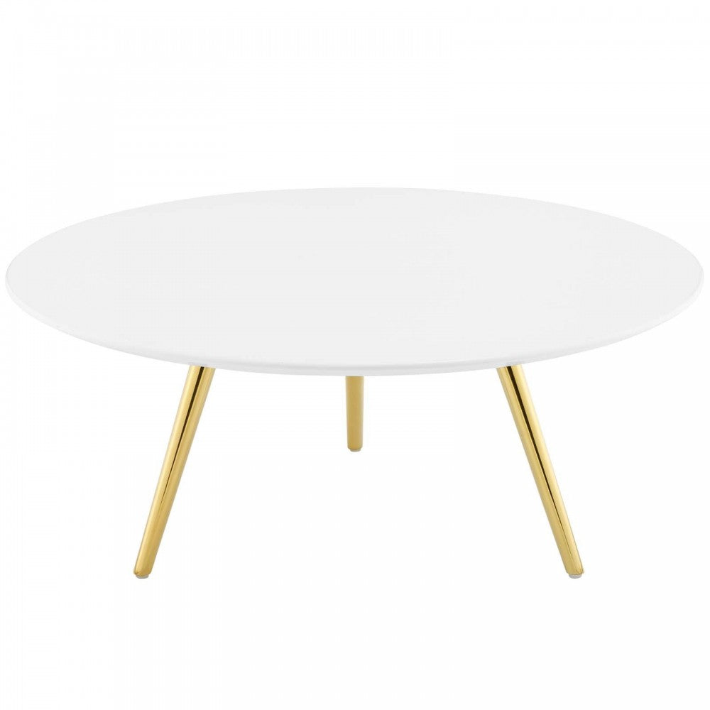 Reflecting a seamless organic shape and timeless form, the Lippa Table has become a symbol of modernism for over the past 60 years. Before its release, homes were filled with clunky remnants of an industrial age long gone by. But in order to advance into the new world, homes first had to transition from the traditional square table, into a piece that connoted progress. A twist on the original design, this coffee table features a round white lacquered MDF table Top lacquered with a scratch-resistant finish and tripod base with tapered metallic gold dowel legs. This rendition of Lippa is a coffee table that's perfect for the living room, lounge area, or home office.