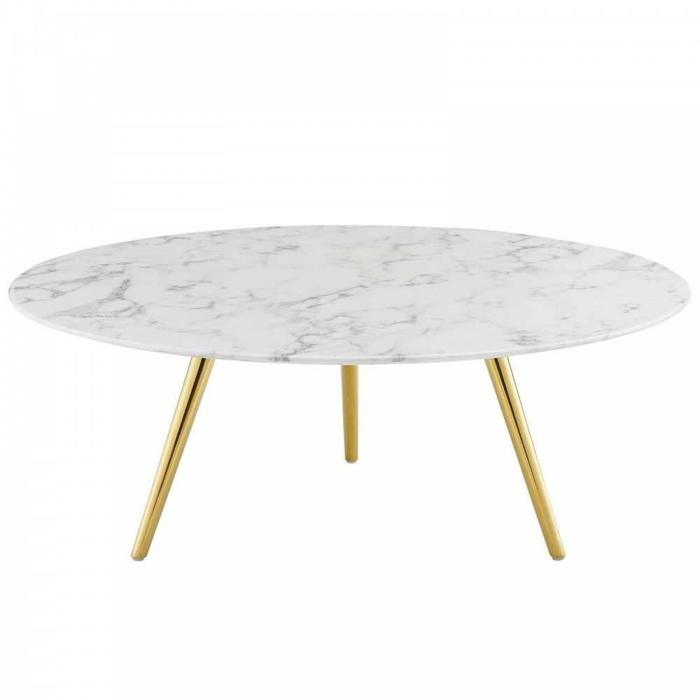 Reflecting a seamless organic shape and timeless form, the Lippa Table has become a symbol of modernism for over the past 60 years. Before its release, homes were filled with clunky remnants of an industrial age long gone by. But in order to advance into the new world, homes first had to transition from the traditional square table, into a piece that connoted progress. A twist on the original design, this coffee table features a round white faux marble table Top lacquered with a scratch-resistant finish and tripod base with tapered metallic gold dowel legs. This rendition of Lippa is a coffee table that's perfect for the living room, lounge area, or home office.