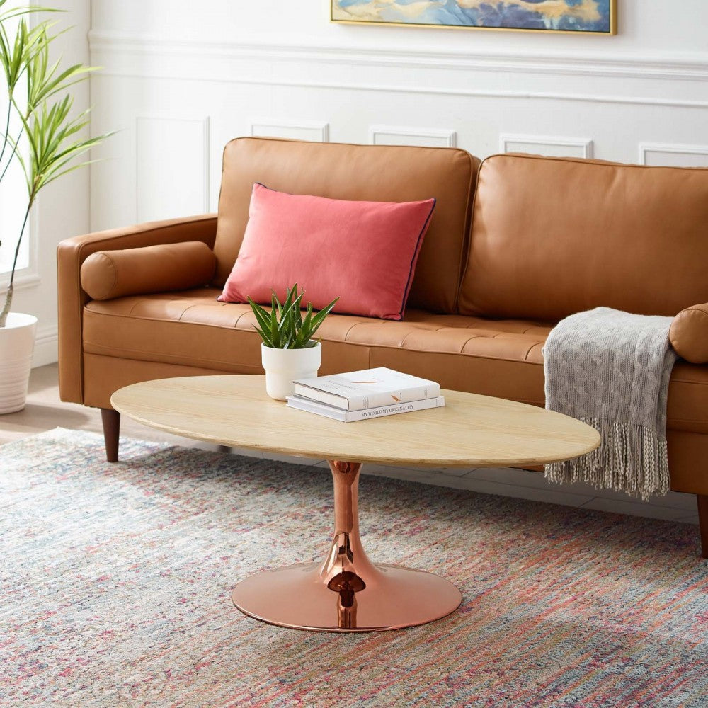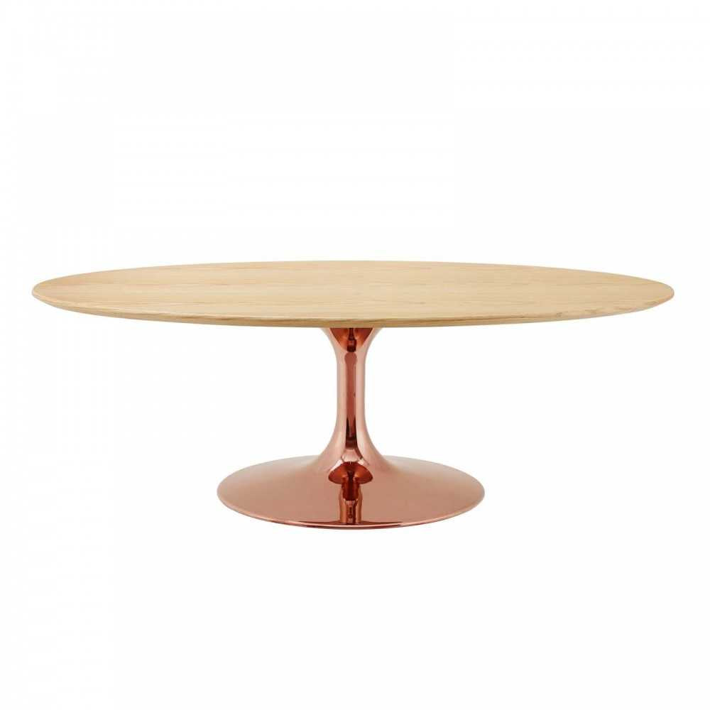 Reflecting a seamless organic shape and timeless form, the Lippa Table has become a symbol of modernism for over the past 60 years. Before its release, homes were filled with clunky remnants of an industrial age long gone by. But in order to advance into the new world, homes first had to transition from the traditional square table, into a piece that connoted progress. The base and dimensions are true to the original specifications, while the table"™s oval MDF top features an easy-to-clean wood grain veneer and the metal tapered base features a polished rose gold finish.