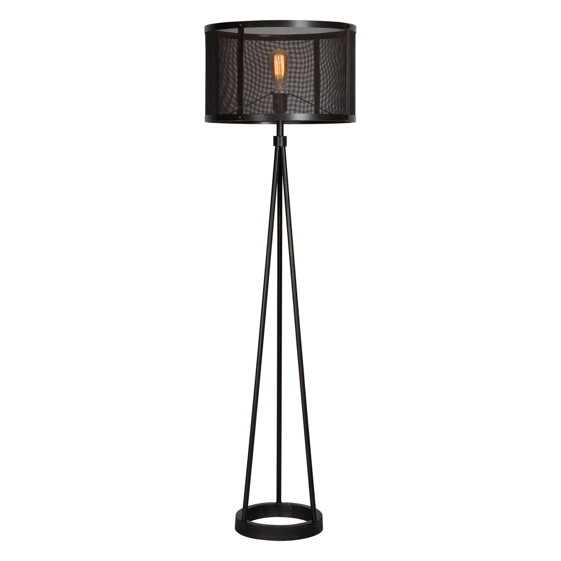 With inspiration from the Industrial Age, the forms and finishes of this decorative floor lamp keep your factory-style room at the forefront of design trends. The traditional tripod base and circular metal-mesh shade are framed in steel and finished in black. Enhance the lamp's vintage essence by installing an Edison-style bulb. Bulb not included.